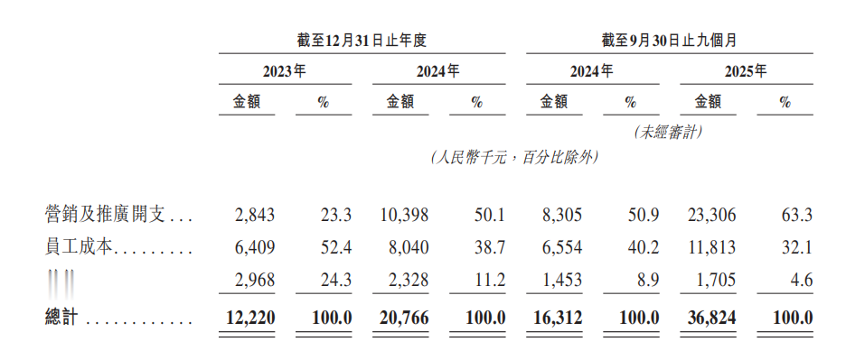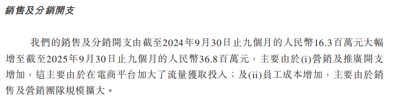 财务数据显示,桑尼森迪的营销推广开支从23年占总体的23%左右一路高涨到25年前三季度的63.3%。在详情中,公司表明对电商平台流量获取的重金投入导致了绝对值大幅上涨。