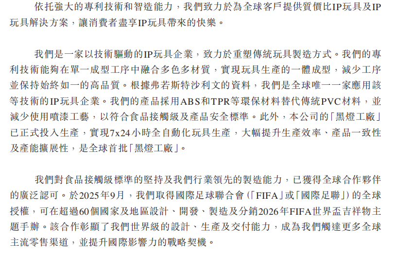 在招股书中,桑尼森迪将自身定义为以技术驱动的IP玩具企业,并用大部分篇幅展现了自己在生产技术、制造规模、供应链速度和IP变现能力上的优势,这也是桑尼森迪在24年以前的核心业务。