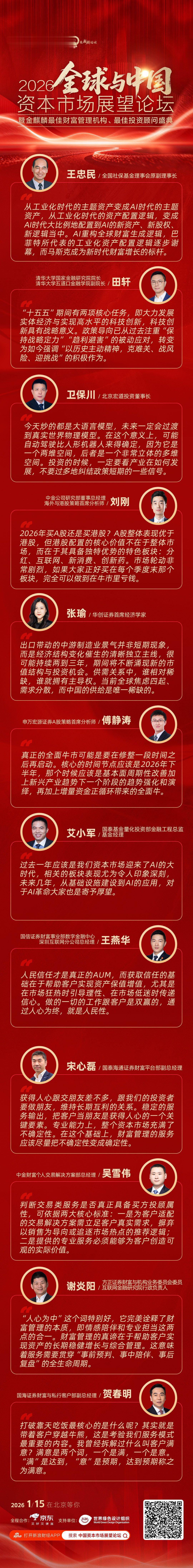 1月15日,2026全球与中国资本市场展望论坛举行,大咖云集,共话AI时代财富新逻辑与资本市场未来。嘉宾表示,从巴菲特到马斯克,AI重构全球财富生成逻辑!A股牛市没有结束,仍有较大纵深与后续演绎空间!风格轮动剧烈,警惕“牛市里亏钱”。