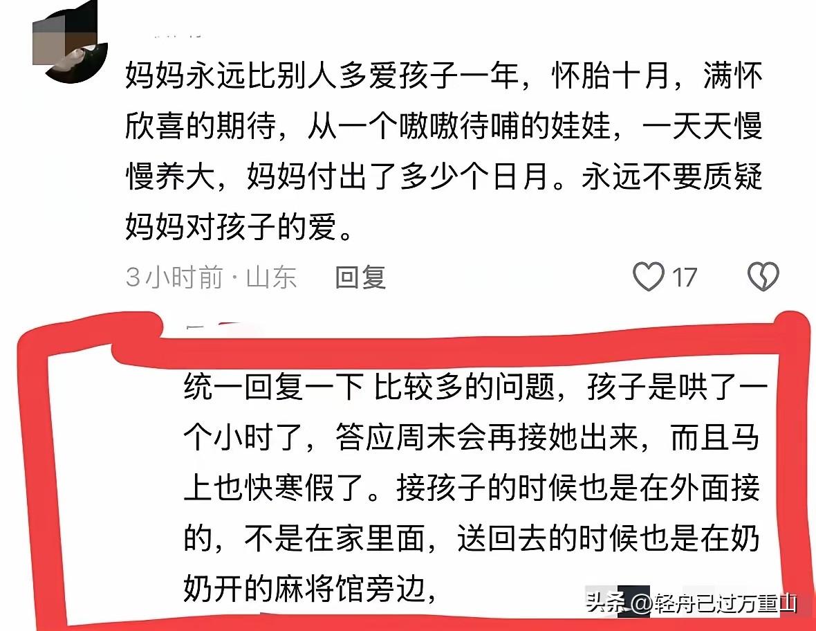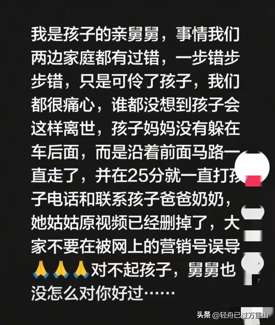 1月11日,一个9岁女孩哭着找妈妈,最后绝望之下倒地身亡,诊断“心源性休克”,姑姑说以往没有病史,她才9岁。 她的爸爸妈妈已经离婚了,她的抚养权归爸爸,但是允许妈妈去看望她,当天是妈妈去看她的日子,但是愉快的时间总是短暂,相处几个小时后妈妈要走了,女孩情绪很低落,一直舍不得妈妈离开。 估计思念妈妈的情绪积蓄已久,看她恋恋不舍很伤心,当时妈妈也很不舍,已经哄了她一个多小时,并把她送到了奶奶麻将馆门口,然后妈妈趁她不留意偷偷走了,没想到,她跑去找妈妈,在路上来回徘徊,当时不知道她有多心痛,最终,悲剧却还是毫无征兆的发生了! 当时她孩子撕心裂肺的哭喊里,满是 “妈妈别走” 的哀求,更藏着被抛弃的深深恐慌。医生说的 “心源性休克”,哪里是什么无病史的突发意外,分明是情绪到了极致的崩溃,最后心脏实在承受不住那种绝望,倒地不起。 最主要的是当时家人没有第一时间发现,妈妈也一直挂念她走了以后一直拨打她的电话手表,但是一直没有接听,于是发微信问她爸爸,爸爸说自己不在家,妈妈图形他看微信定位,爸爸说回去了,想不到她就倒在距离家不远的地方,永远停止了呼吸。 悲剧发生了,大家一个怪一个,孩子的姑姑说“孩子妈妈哪怕回头看一眼都不会这样”,意思是说孩子母亲太心狠了,都不回一下头。还有人说妈妈故意躲在车后面,让孩子找不到。对此孩子的舅舅发声了,他说两家人都有错,一步错步步错,最可怜的是孩子。当时妈妈没有躲在车后面,而是离开孩子以后就一直沿着马路走了。 母亲估计觉得孩子状态不好吧!走了以后的25分钟一直打电话给孩子,可惜再也没有听到女儿的声音了。听舅舅这样说,两个人离婚估计闹得也很不愉快,对孩子来说伤害太大了。据说孩子的父亲已经在办理保险公司意外死亡赔偿金的事情了,一个生命就这样结束了,实在可怜啊! 已婚人士,能凑合着过就不要离婚了,离婚对孩子真的是致命性的伤害,就算孩子不死,内心也是伤痕累累。