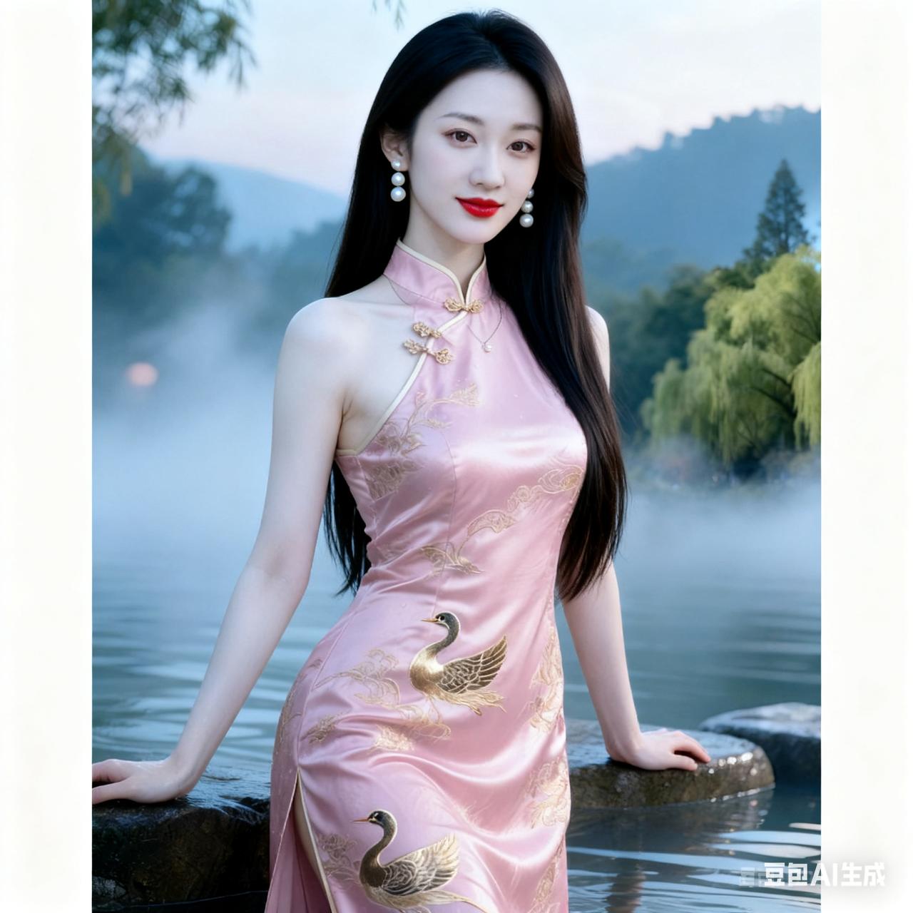仙气缭绕的粉色旗袍,水中仙子般的优雅姿态