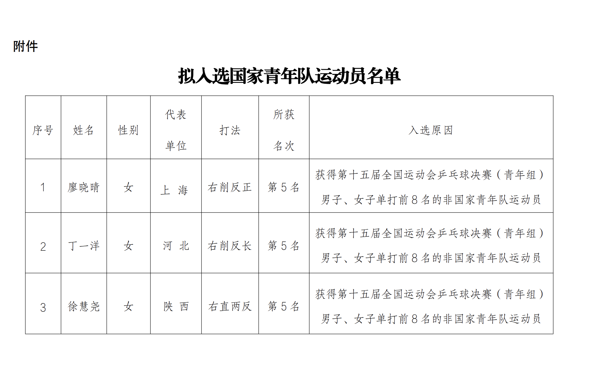 3名运动员拟入选国乒青年队中国乒乓球协会发布关于对拟入选国家青年队运动员公示的通