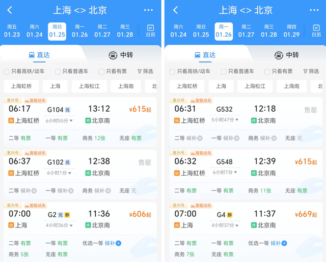 京沪高铁是备受关注的线路。实施新列车运行图后,上海开往北京的“大站停”标杆高铁列车在开行时间上“前延后续”,首趟“大站停”列车由原先7时整从上海站出发,提前至6时43分上海虹桥站出发;末班“大站停”列车由原先18时52分上海虹桥站始发的G28次列车,变更为G32次、19时25分虹桥站发车。从开行数量上看,往返于京沪两地之间的列车对数由原先的47对增加至48对,其中“大站停”标杆列车增加2对。