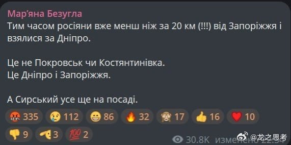 俄乌风云录,俄军距离扎波罗热不到20公里。乌议员别祖拉表示,俄军距离扎波罗热不到20公里,且已加强对第聂伯河方向的行动:“这里不是波克罗夫斯克或科斯坦丁尼夫卡。这些是第聂伯河和扎波罗热河。”根据乌军媒深州的战线图,前线到扎波罗热市区的最短距离为20.78公里。国际军事
