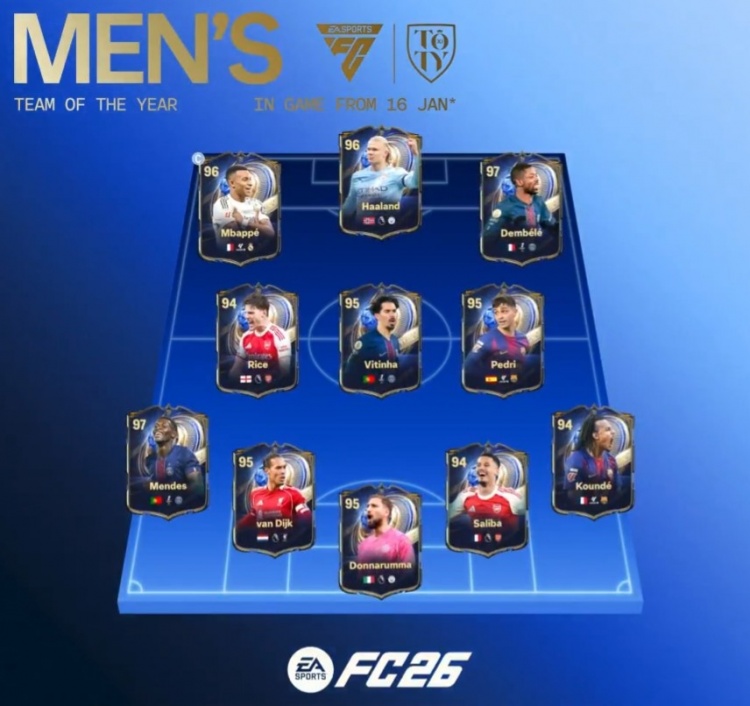 直播吧1月15日讯EA已经官宣FC26的年度蓝11人阵容,和此前博主爆料一致。姆巴佩队长,登贝莱和努诺·门德斯获评97最高。