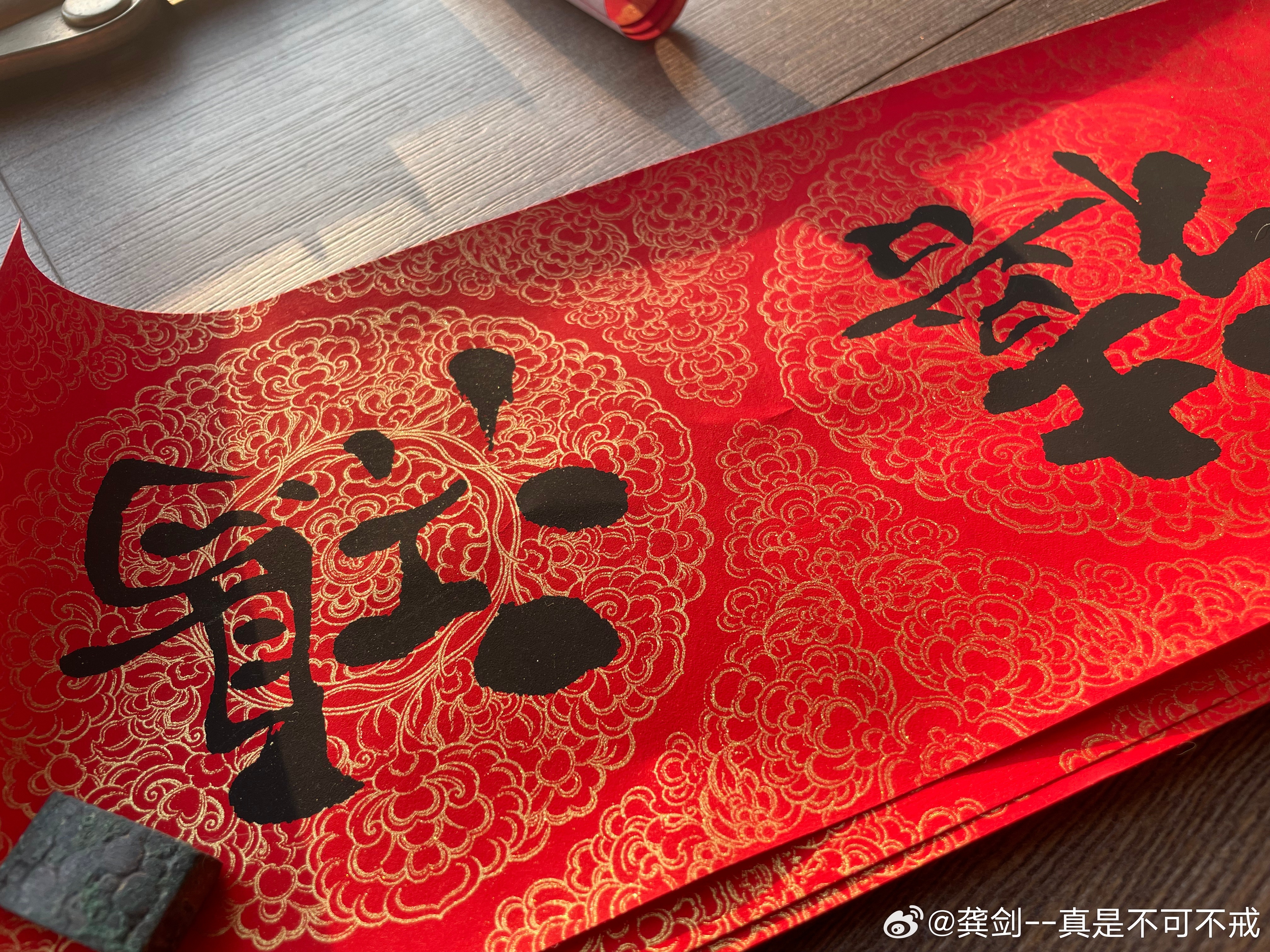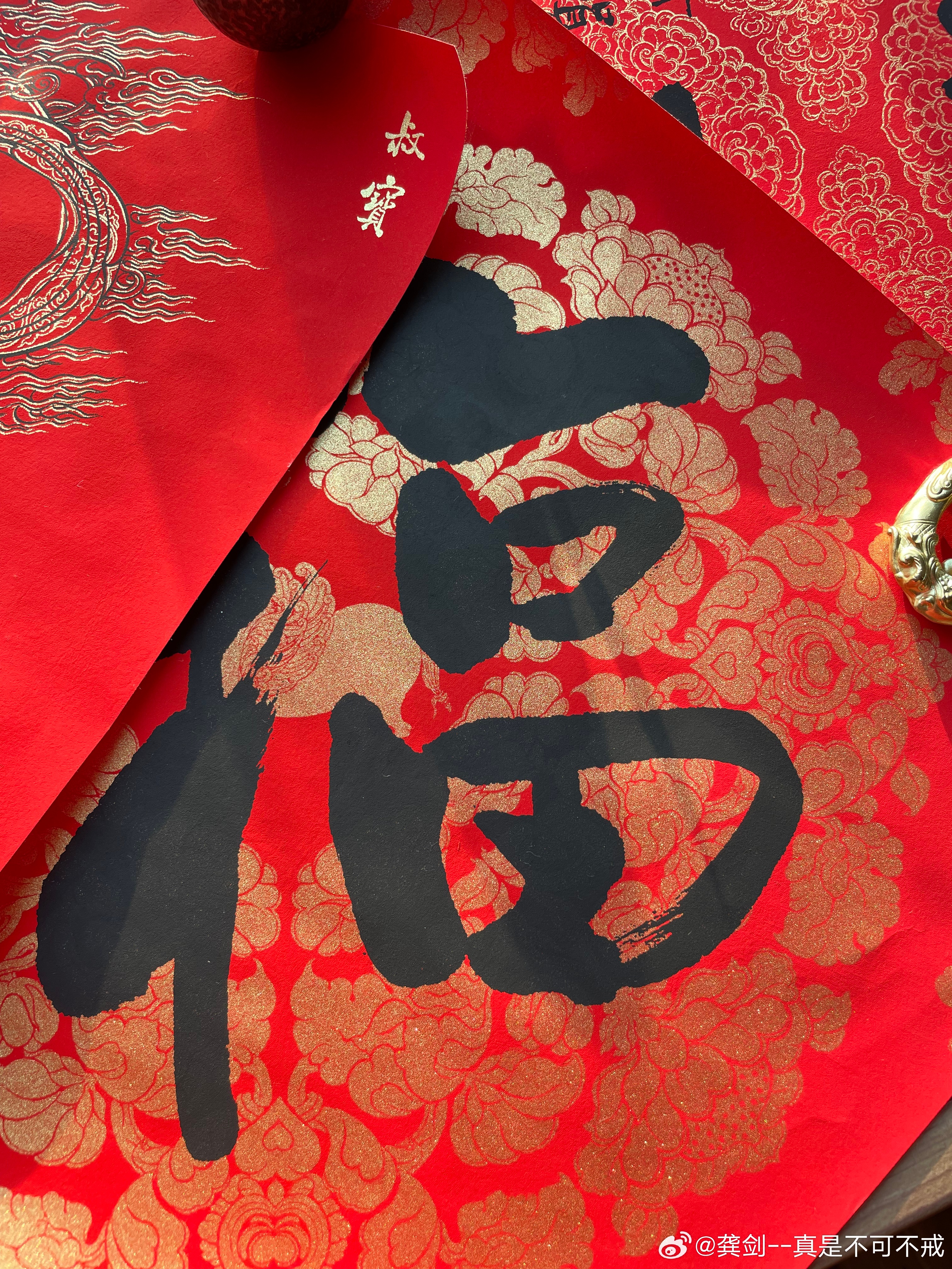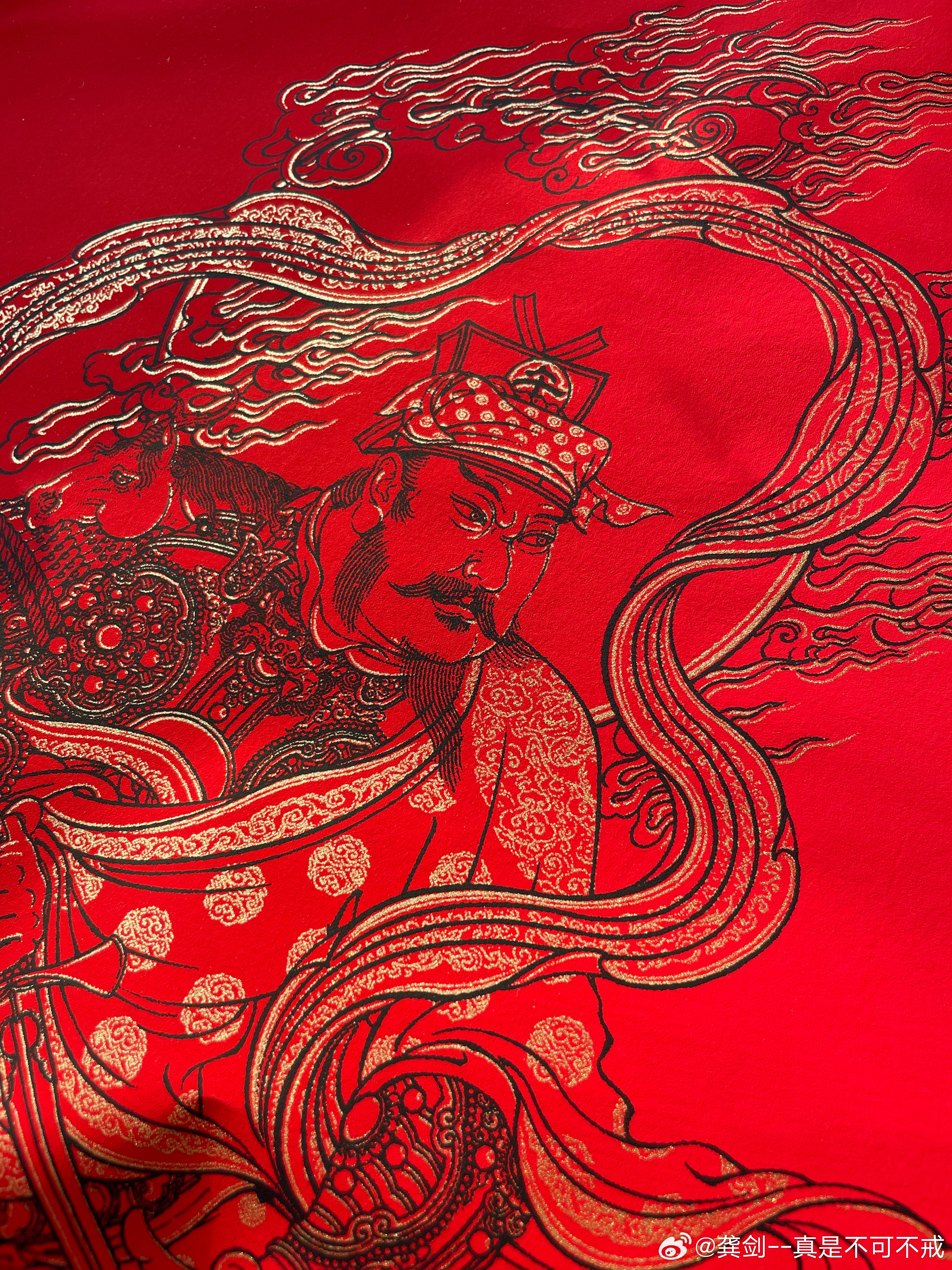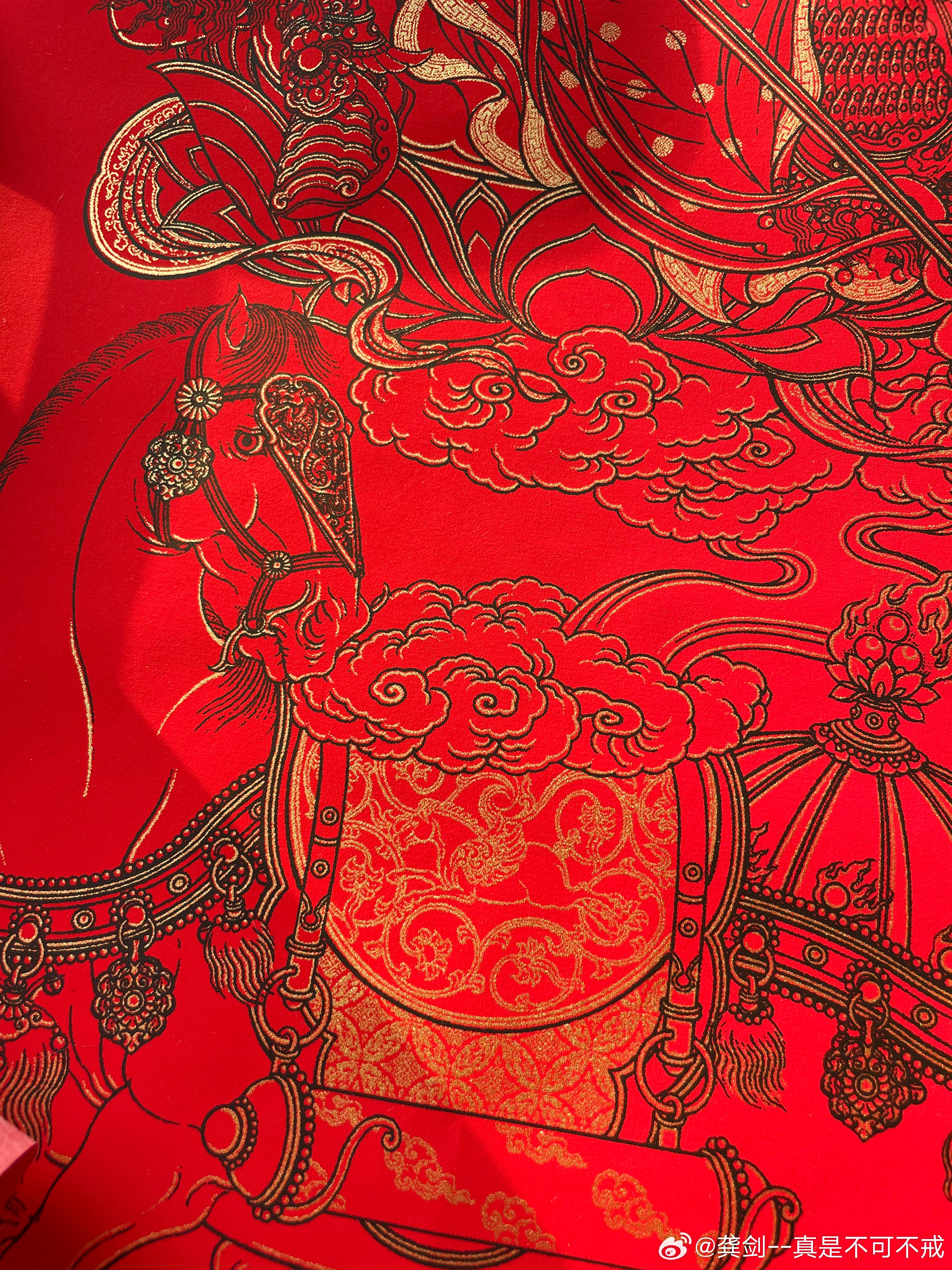 每年这个时候,都得入聂兄家的对联和门神。今年的金色和红色还是老配方,但是人物构图和之前的有点差异,整体是采用晚唐五代文殊菩萨骑青狮、普贤菩萨骑白象的姿态。小时候最喜欢听《隋唐演义》,秦叔宝一对熟铜锏“马踏黄河两岸,锏打三州六府”,隋唐演义中秦琼的武艺远排在十多位,其实两唐书中记载的的秦琼是勇冠三军,属于一流勇将,经常在万军丛中取上将首级。今天阳光好,光线下金色真美好。