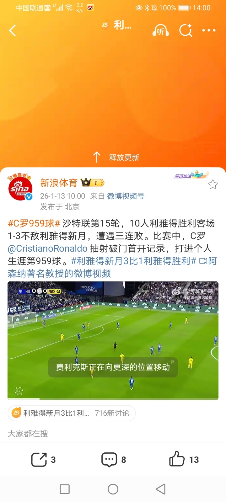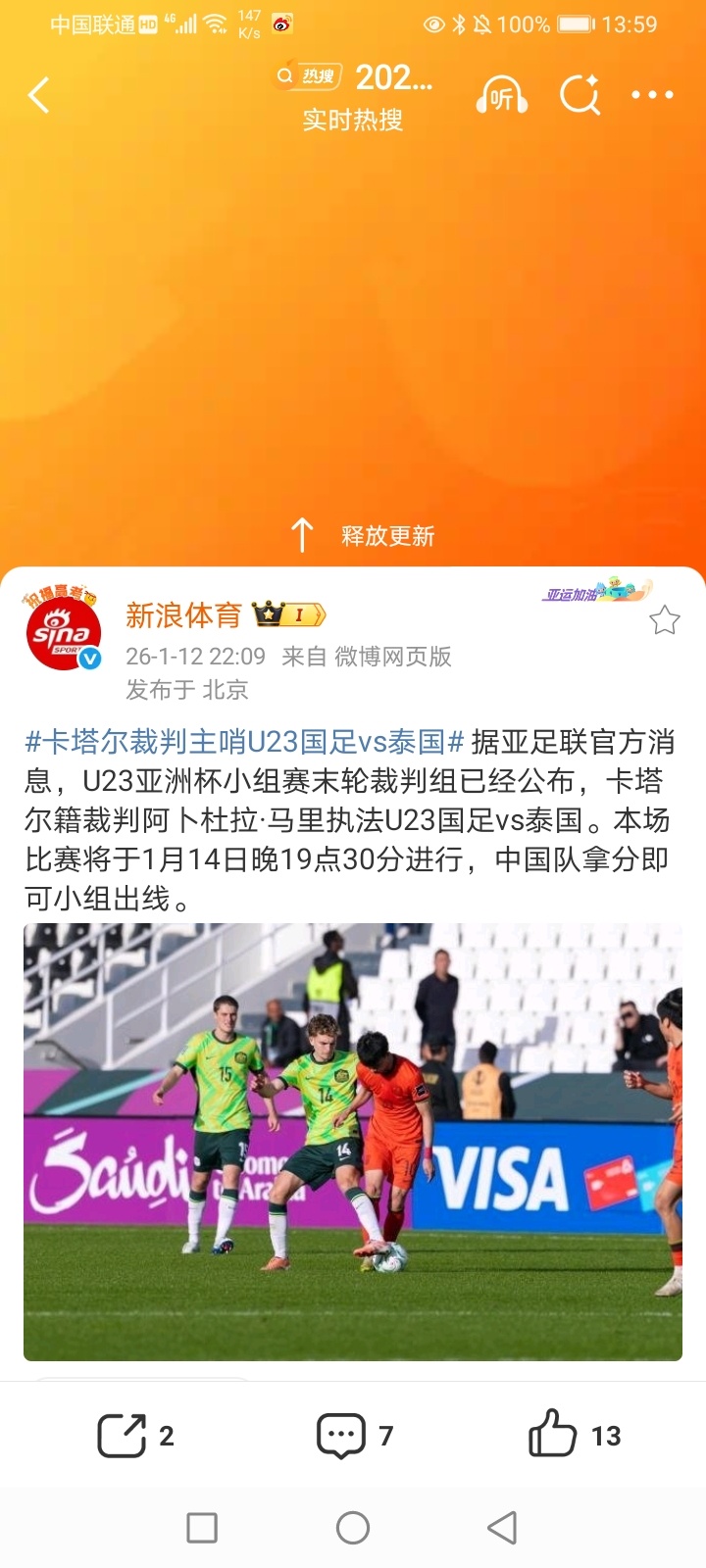 2026年1月13日-2025-2026CBA常规赛第14轮(第一阶段第14轮) 顶住对方末节疯狂反扑 在沈梓捷再次伤退的不利局面下 北控94-91绝杀福建(潜力赛:26-28)/广州93-98天津(天津男篮终结两连败)/浙江稠州103-68大胜四川(浙江稠州男篮获得四连胜/四川男篮遭遇十四连负 继续一胜难求积分榜垫底) 2025-2026WCBA常规赛A组第15轮(第一阶段第15轮) 武汉74-77被江苏逆转(武汉女篮终结两连胜)/广东(东莞)75-83被山东逆转(山东女篮获得两连胜/卫冕冠军广东女篮终结十四连胜 遭遇赛季首败)/陕西64-107惨败山西(山西女篮获得四连胜/陕西女篮遭遇两连败 继续排名小组积分榜倒数第二)/北京80-97被上海大逆转/四川105-62大胜浙江(上届亚军四川女篮获得五连胜/浙江女篮遭遇四连败 继续排名小组积分榜垫底) 2026亚足联U23男足亚洲杯小组赛A组第3轮(最后一轮) 沙特0-1越南(越南获得三连胜 小组积分榜榜首晋级8强/沙特1胜2负无缘8强) 部分重点赛事预告:CCTV5直播:19:30 2025-2026CBA常规赛第14轮(第一阶段第14轮) 南京(同曦)-广东 CCTV5+直播:19:25 2026亚足联U23男足亚洲杯小组赛C组第3轮(最后一轮) 乌兹别克斯坦-韩国 CCTV5客户端直播:19:30 2025-2026CBA常规赛第14轮(第一阶段第14轮) 辽篮-青岛 19:00/20:00 2025-2026女排超级联赛A级常规赛第一阶段第10轮 北京-河南/*天津-山东 19:00/20:00 B级第10轮 河北-浙江/四川-云南 其他:19:35(4场)/20:00 2025-2026CBA常规赛第14轮(第一阶段第14轮) 宁波-山西/山东-吉林/深圳-上海/北京-江苏/*新疆-浙江广厦 19:30 2025-2026WCBA常规赛B组第15轮(第一阶段第15轮) 合肥-厦门