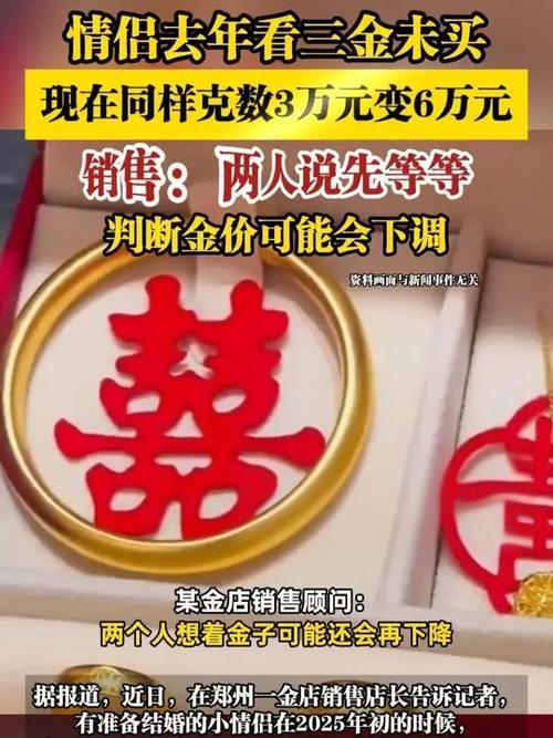 郑州这对准新人在2025年初看结婚三金3万多没下手,年底再去同款同克重直接飙到6万多,翻了一倍!金店店长都劝:买金要趁早,涨了你是赢家,跌了还在你家 。 这波金价涨得有多疯?2025年国际金价破3350美元/盎司历史高位,国内足金饰品价飙到1053元/克,三年涨超100% 。传统50克三金,三年前2.25万,现在能到5.14万,叠加品牌工费,单价超1300元/克 。 备婚党被逼出不少招:有去银行买金条找工匠打,能省近万元品牌工费;还有新人直接租三金,仪式办完就还,省一大笔钱 。 也有人说金价还得涨,早买早安心;也有人怕高位接盘,想再等等。你要是备婚,会咬牙买、找平替还是先租着用?