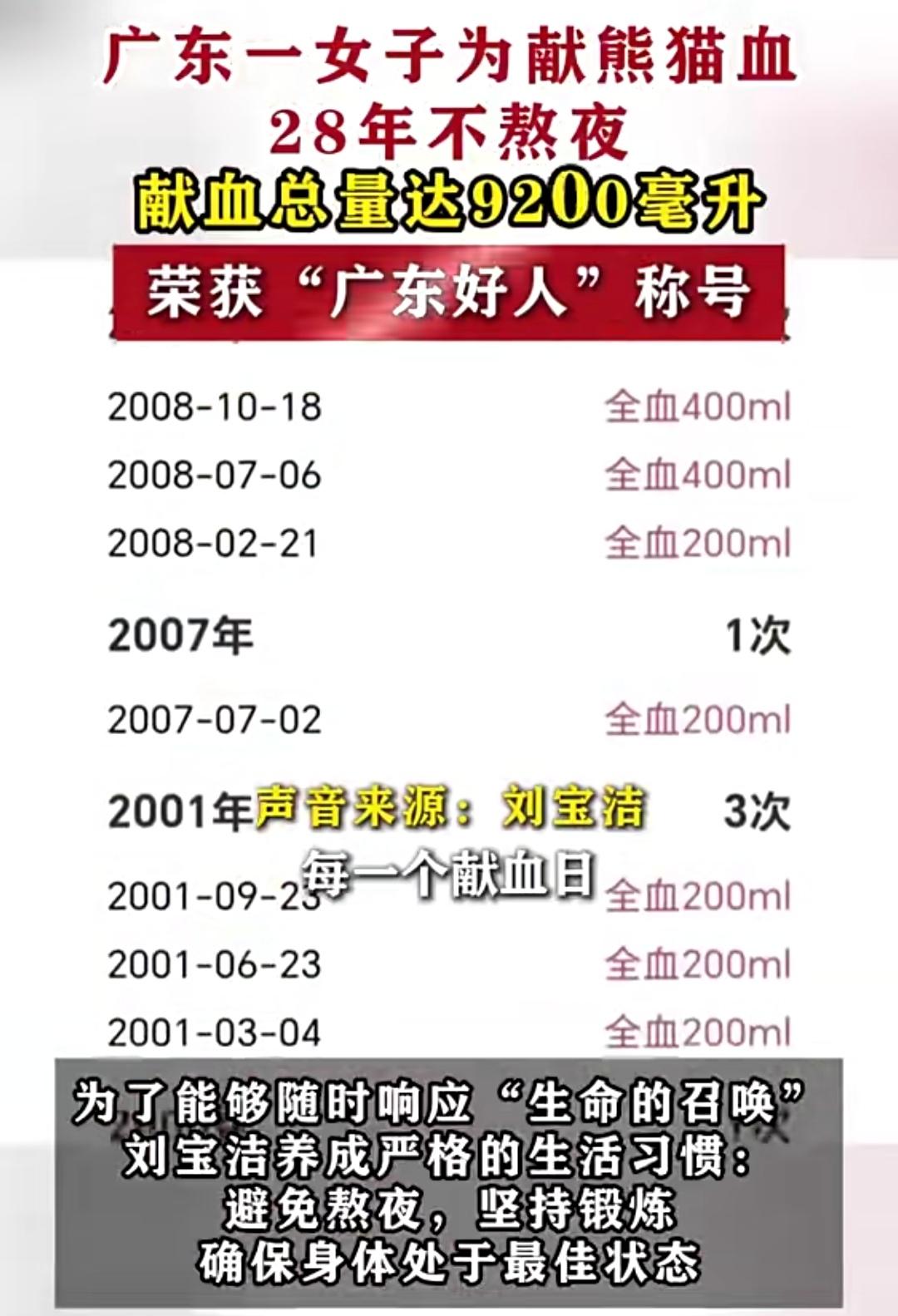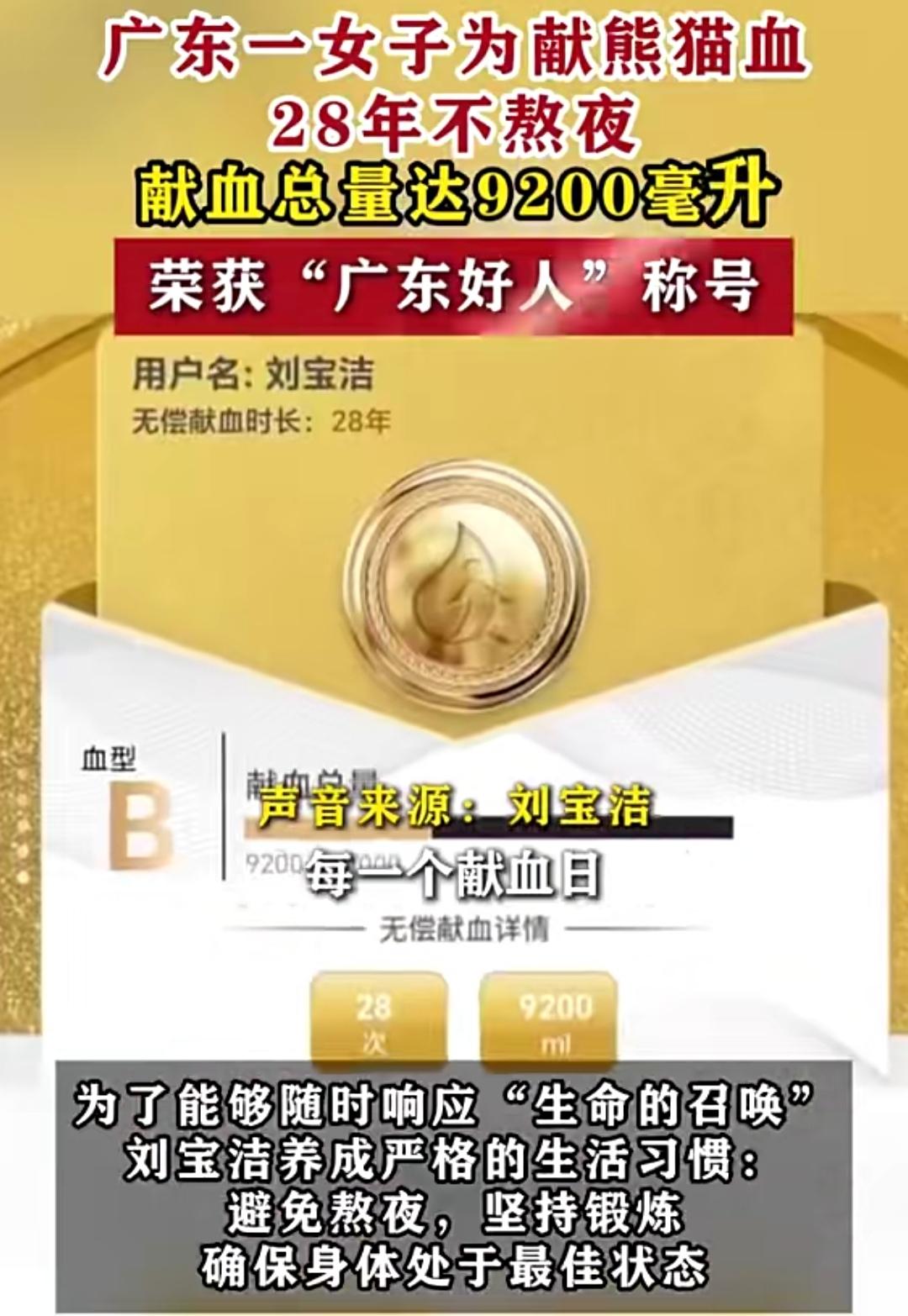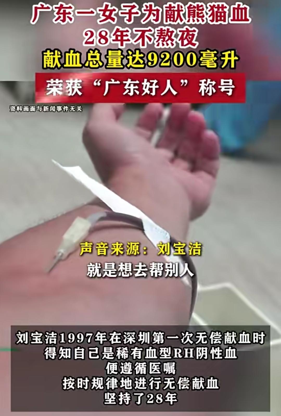 广东阳江50岁的刘宝洁,获评“广东好人”,靠的是28年的坚持与善良! 她是RH阴性熊猫血,28年累计献血28次、9200毫升,是阳江特殊血型献血量最高的人,还拿过全国无偿献血奉献奖银奖。 为了能随时应急献血,她28年自律到极致:不熬夜、坚持锻炼,始终保持最佳身体状态,深夜接到血站电话,总能第一时间赶过去,妥妥的随叫随到! 这份坚持的初心特别感动人:小时候她遇车祸被人救过,感受过他人温暖,就想着一定要把这份善意传下去,“感受过温暖,更懂助人的力量”。 9200毫升血,是无数生命的希望;28年的坚守,是刻在骨子里的善良。比起荣誉,这份说到做到的担当和懂得回馈的心意,才最珍贵!为刘阿姨点赞!