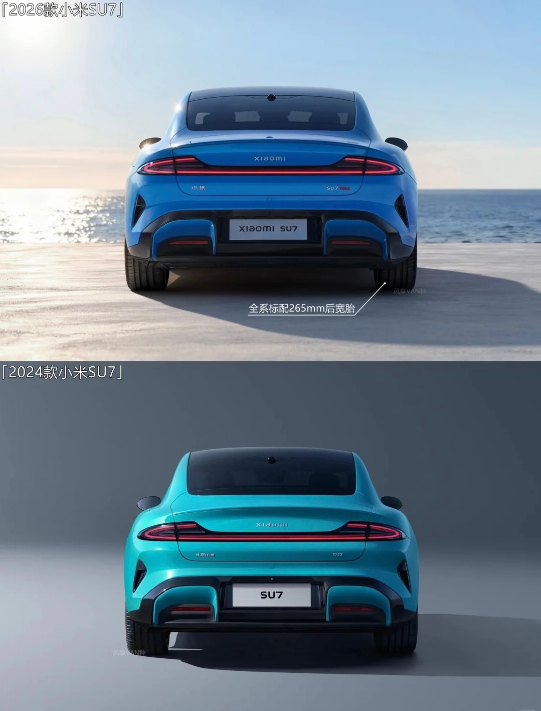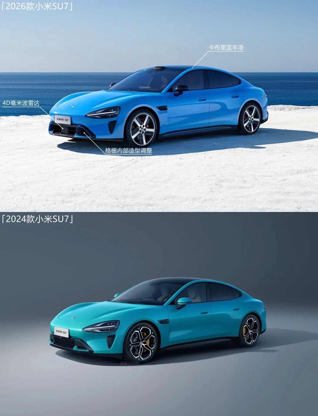 2026款小米SU7外观内饰对比解析预售价22.99-30.99万元,新一代小米SU7将于4月份上市。2026款小米SU7在外观、内饰、底盘、动力、辅助驾驶系统方面均进行了升级调整。外观部分,2026款小米SU7外观造型整体延续了2024款车型的设计,外观部分比较明显的变化包括前格栅内部结构调整、牌照框下方新增4D毫米波雷达、黑色外后视镜、新款20英寸锋刃轮毂以及全新卡布里蓝车漆。内饰部分,2026款小米SU7内饰进行了重新设计,整体布局不变,但方向盘、副仪表台、座椅均有调整,新款SU7采用双色方向盘、方向盘多功能按键调整、副仪表台布局调整、杯架分区重新设计、座椅及门板缝线调整、车门应急机械拉手调整、氛围灯重新设计,同时提供全新暗夜黑内饰配色。底盘部分,2026款小米SU7全系标配前四活塞固定卡钳及前245后265宽胎,PRO及MAX版标配闭式双腔空气悬架+CDC可变阻尼减振器。动力部分,2026款小米SU7全系标配V6s电机,标准版及PRO版搭载752V高压平台,MAX版则搭载897V高压平台。续航方面,2026款小米SU7标准版/PRO/MAX版CLTC纯电续航分别为720/902/835公里。辅助驾驶方面,2026款小米SU7全系标配激光雷达以及700TOPS算力Xiaomi HAD端到端辅助驾驶系统。