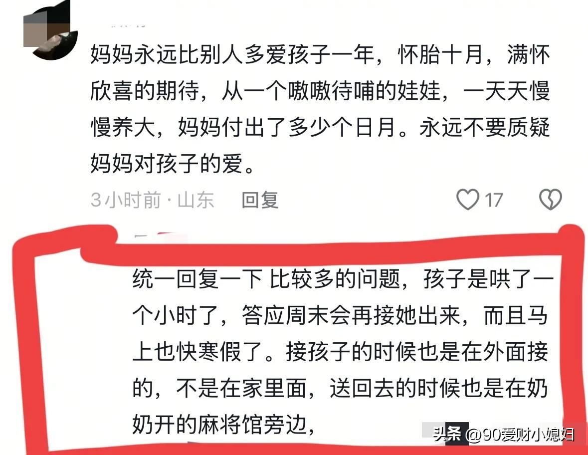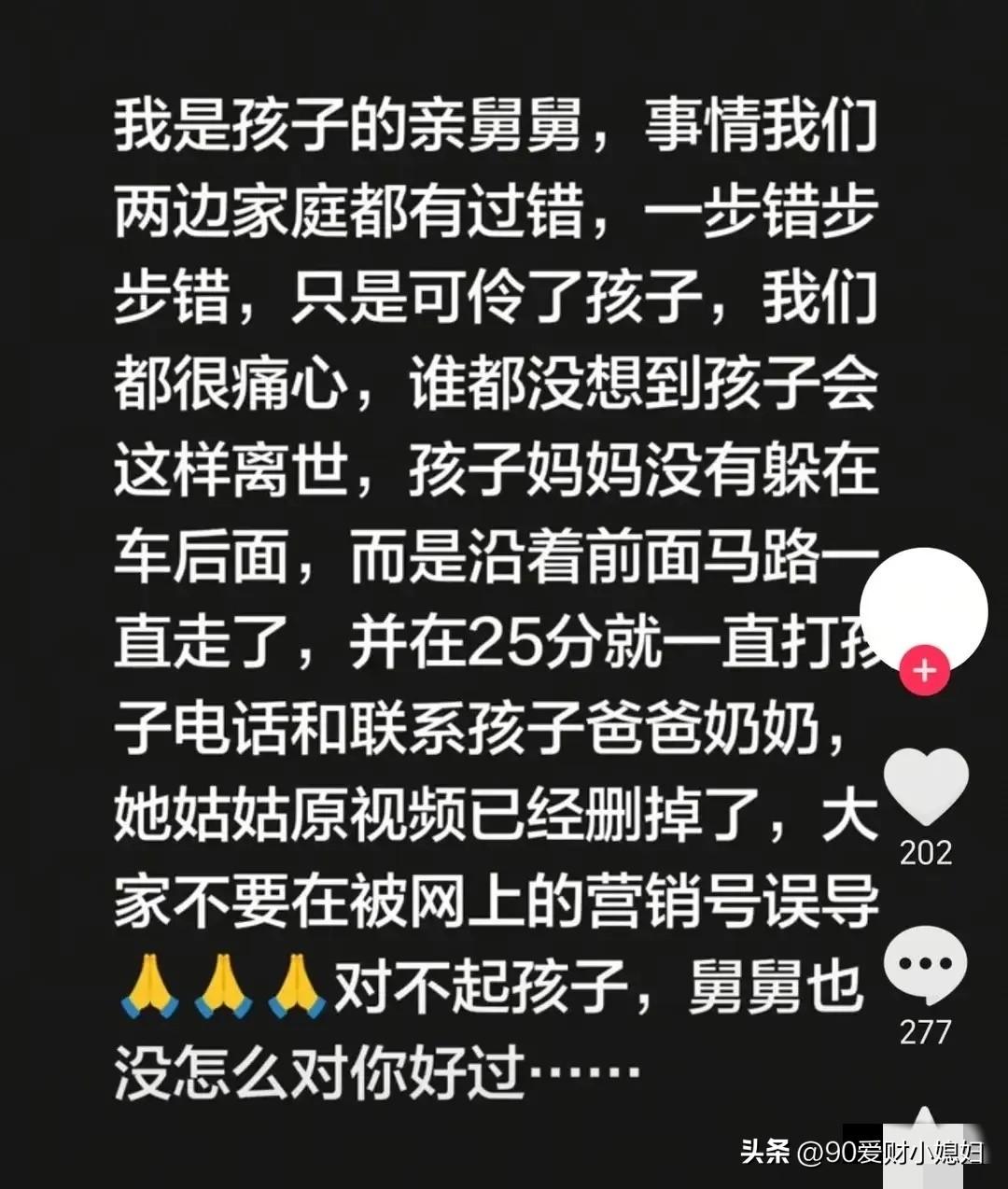 哭着找妈妈的9岁女孩是1月11日离世的,离世后仅两天,其爸爸就在着手办理死亡赔偿金的相关手续了,还跟妈妈讨论金额的分配,如此种种,让人莫名的难过,可见他根本不爱自己的女儿! 也是如果爸爸爱女儿,女儿又怎么会那么依恋妈妈,甚至因为妈妈的离开伤心过度导致意外的发生! 事发当天,妈妈把女儿送到了奶奶的麻将馆门口,为了避嫌她并没有进去。她其实已经哄了女儿一个多小时了,还承诺下个周末再来接她玩,而且也快寒假了,到时也可以接她一起玩一段时间。可不管怎么哄,女儿都不愿意让她走,她实在没办法才丢下女儿急匆匆的走了,她也没躲在车后面,而是沿着路边离开了! 因为她觉得孩子哭一会,等她离开了奶奶哄一哄就会没事了。实在没想到孩子会一个人追过来,而奶奶根本就没管她,更没想到女儿会哭到休克,因为没人及时救治,最终离世了! 她当时离开25分钟,就有给孩子打电话,可怎么都联系不上,她也很担心,又给前夫打电话询问孩子情况,前夫通过女儿电话手表定位确定她回家了,妈妈也就放心了。可女儿压根就没回去,就是这样的疏忽,导致了悲剧的发生! 如果爸爸奶奶能够上心些,在妈妈离开后能够给予安慰,我想她也不会出事吧! 可惜没有如果,她的爸爸甚至在她去世才两天就开始关心赔偿金的问题了,说他有多爱女儿可想而知了!既然不爱,当初又为什么要夺走孩子的抚养权呢? 只是可惜了她出生在一个缺爱的家庭里,才9岁却以这样的离开了人世,让人惋惜,更是心痛不已。 希望下辈子她能出生在一个幸福美满的家庭里,爸爸妈妈恩爱无比,而她是爸爸妈妈最疼爱的小公主!