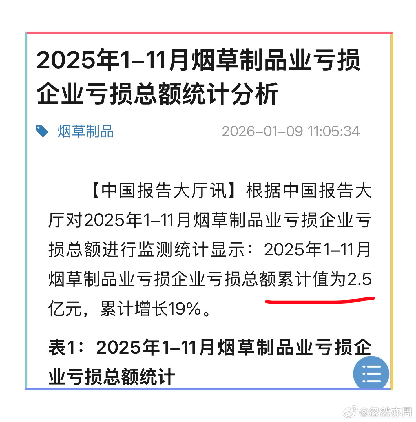 《关于香烟的两个无知的认知》图一:有闲得蛋疼的中国烟民试验发现,一根国产烟只能燃烧四分钟,而日本烟可以燃烧七分钟……我不是烟民,看了也忍不住问一句:这是真的吗?为何烧得这么急?赶着烧完去投胎?图二:“2025年1-11月烟草制品业亏损企业亏损总额累计值为2.5亿元”,来自于我在中国报告大厅网站上的亲手截屏,不是假新闻……新闻保真,但事情本身完全超越了我的认知,烟草也能亏?为啥?因为烟丝烧得还不够快吗?这两件事放在一起,我看不懂、想不通,无法原谅自己的无知。😫