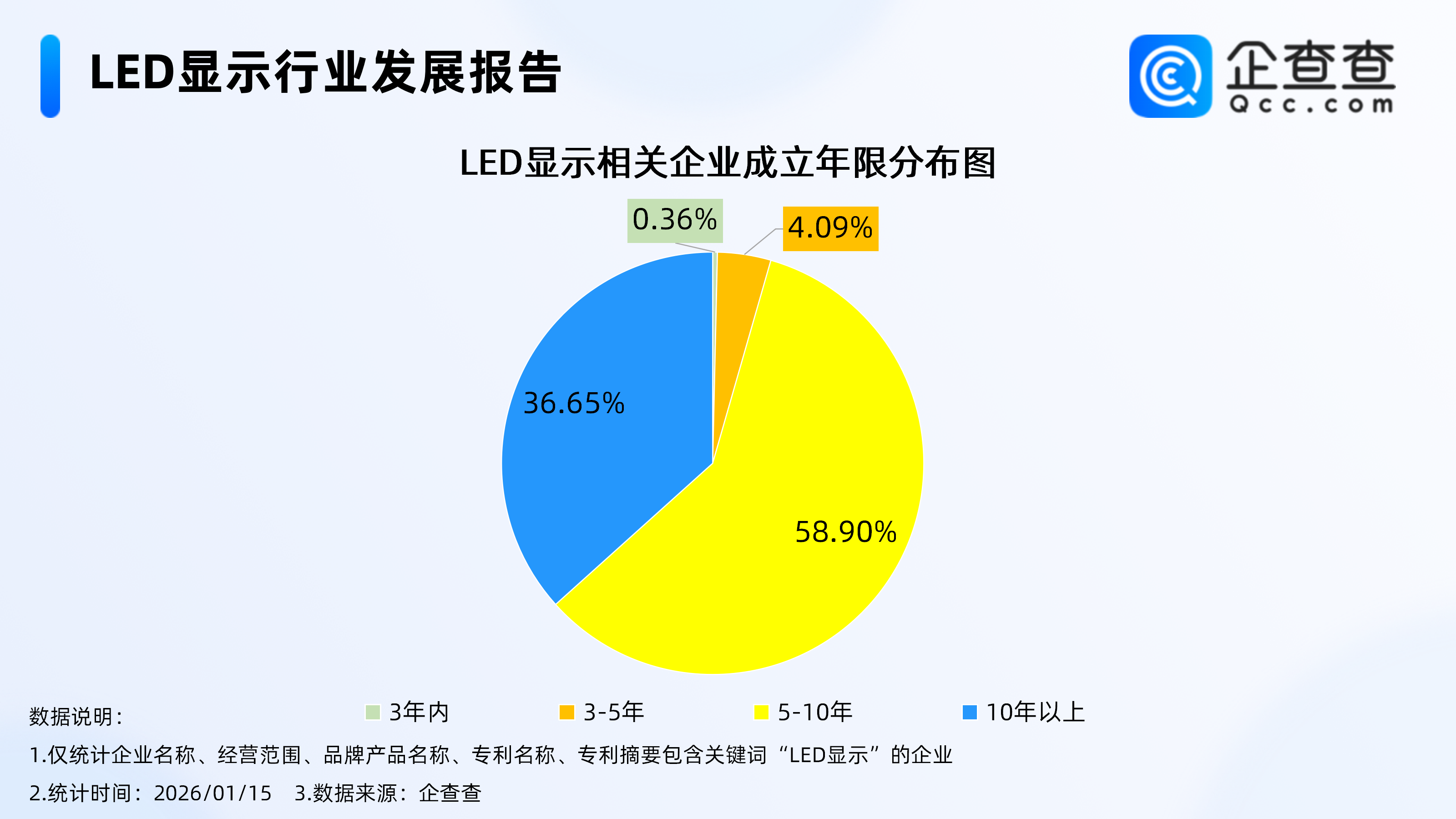 企查查数据显示,截至1月15日,国内现存LED相关企业9.22万家。从经营时间来看,现存LED显示相关企业多为老牌企业,成立年限在5年以上的相关企业超九成,其中成立年限在5-10年的相关企业最多,占比58.90%,在10年以上的相关企业占比36.65%。