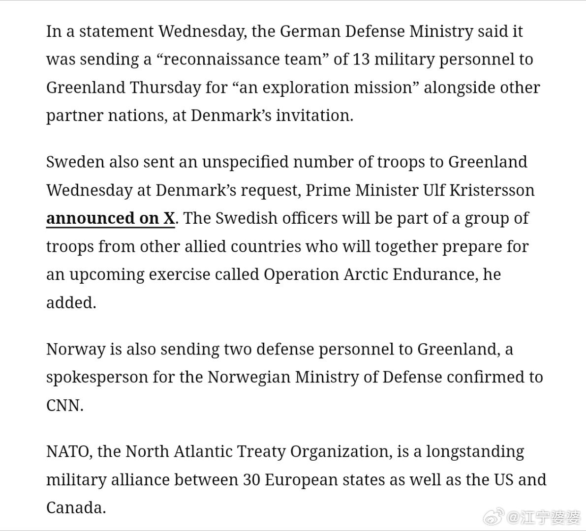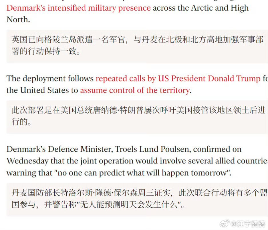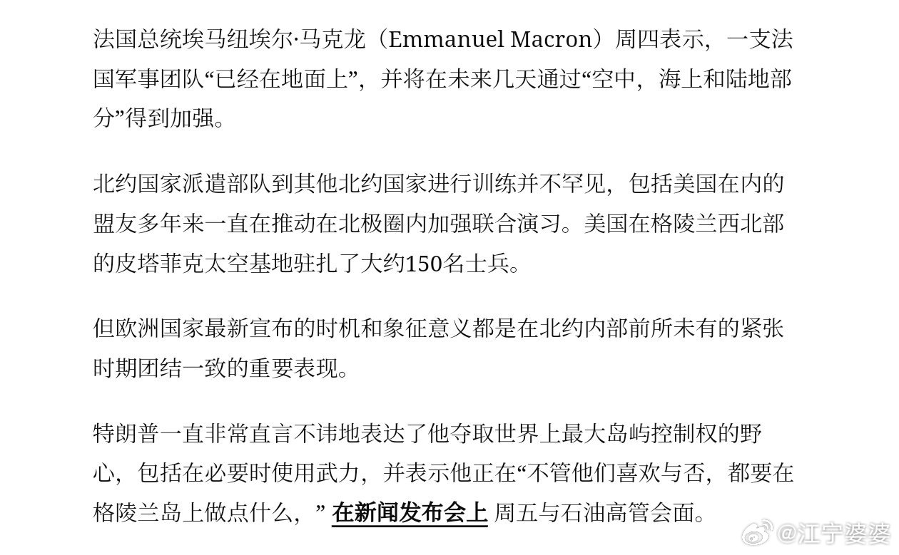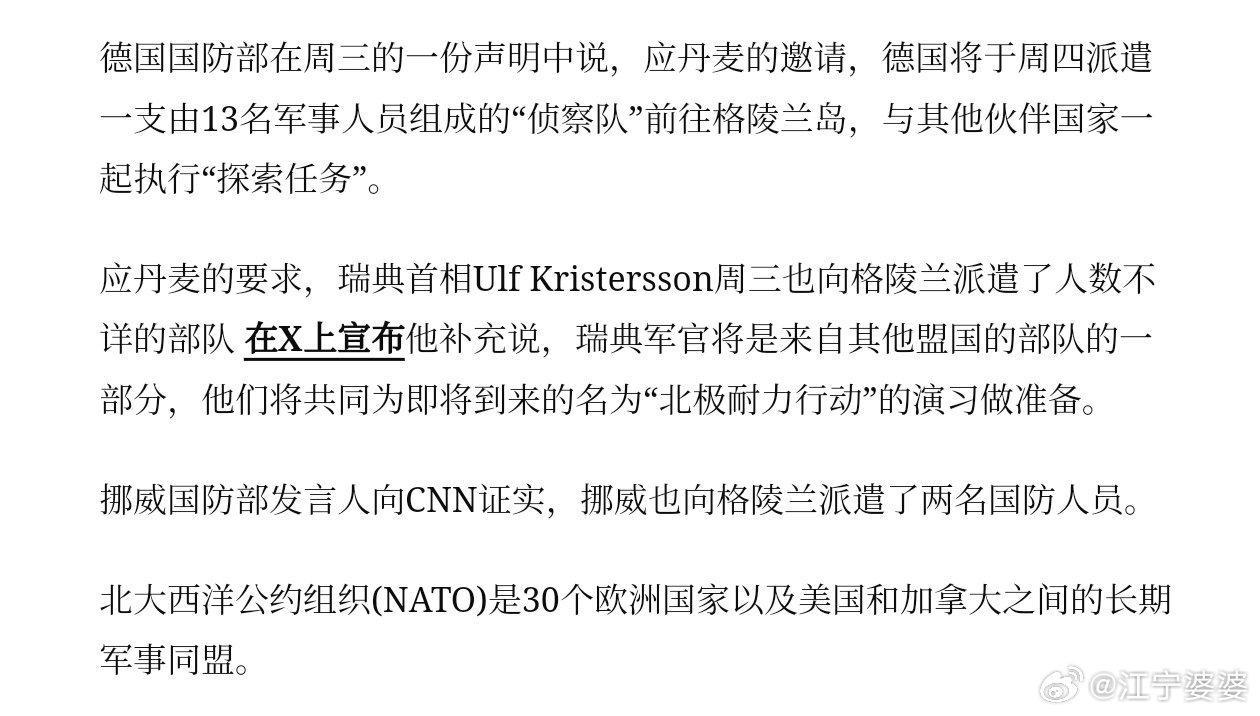 团结的欧洲北约国家已经派出各自的部队准备参加丹麦的军事演习,以此表达团结一致的态度,共同应对美国的可能入侵。目前具体出兵的国家如下:法国:15名军事人员德国:13名军事人员瑞典:不详挪威:2名军事人员英国:1名军事人员客观地说,这个战斗力和我家门口的派出所不相上下,真是一只足以震慑川皇的精锐之师啊