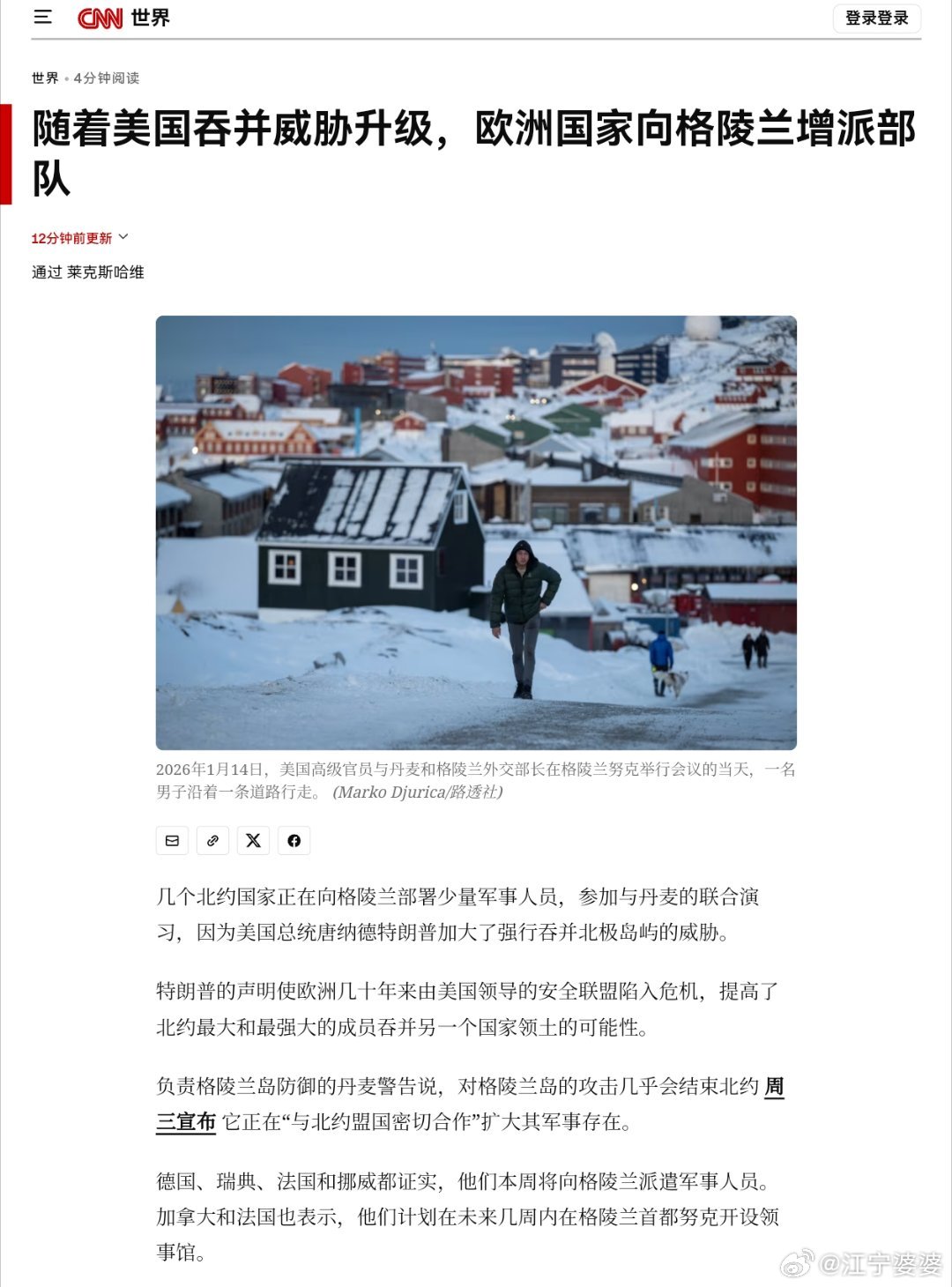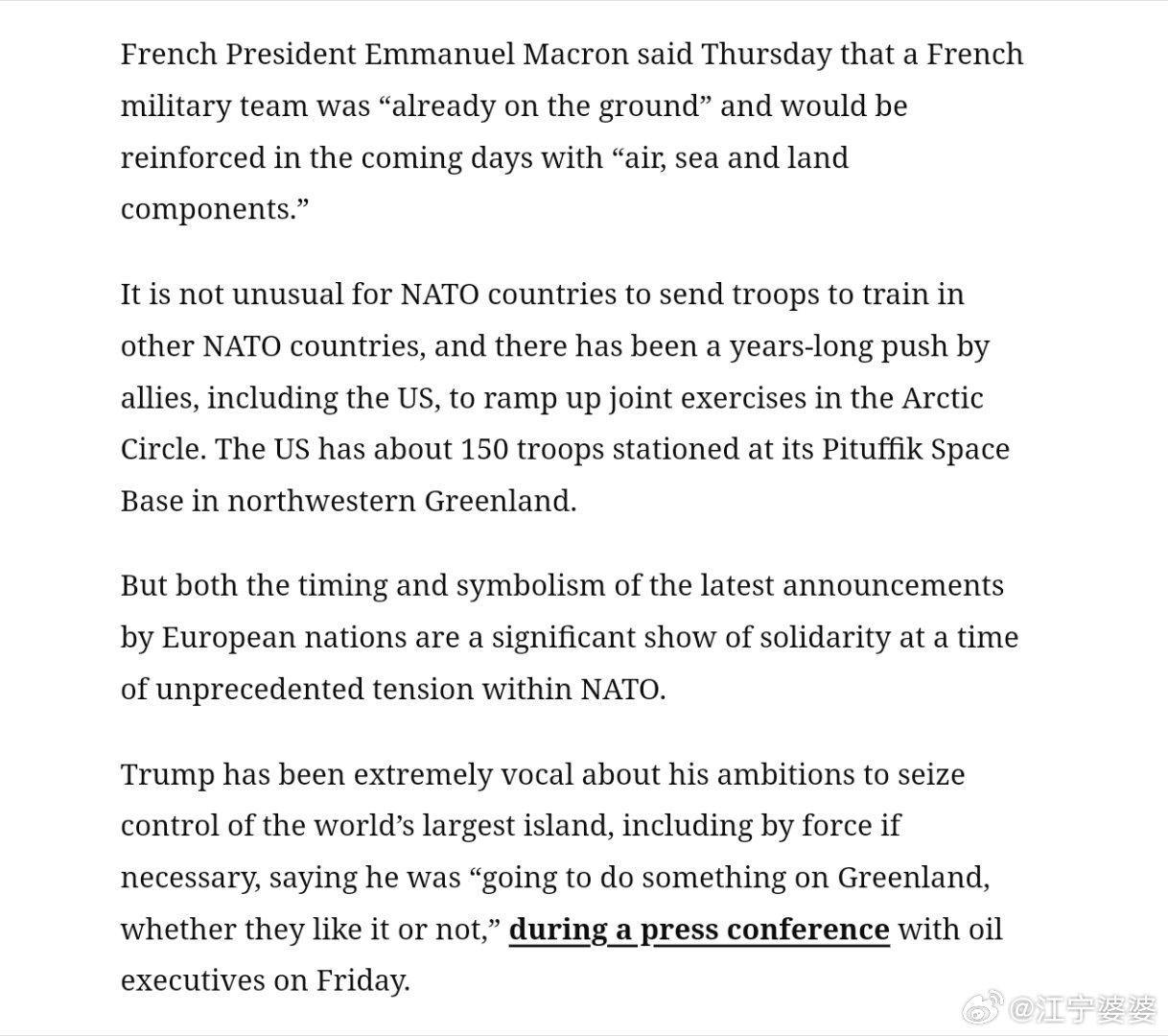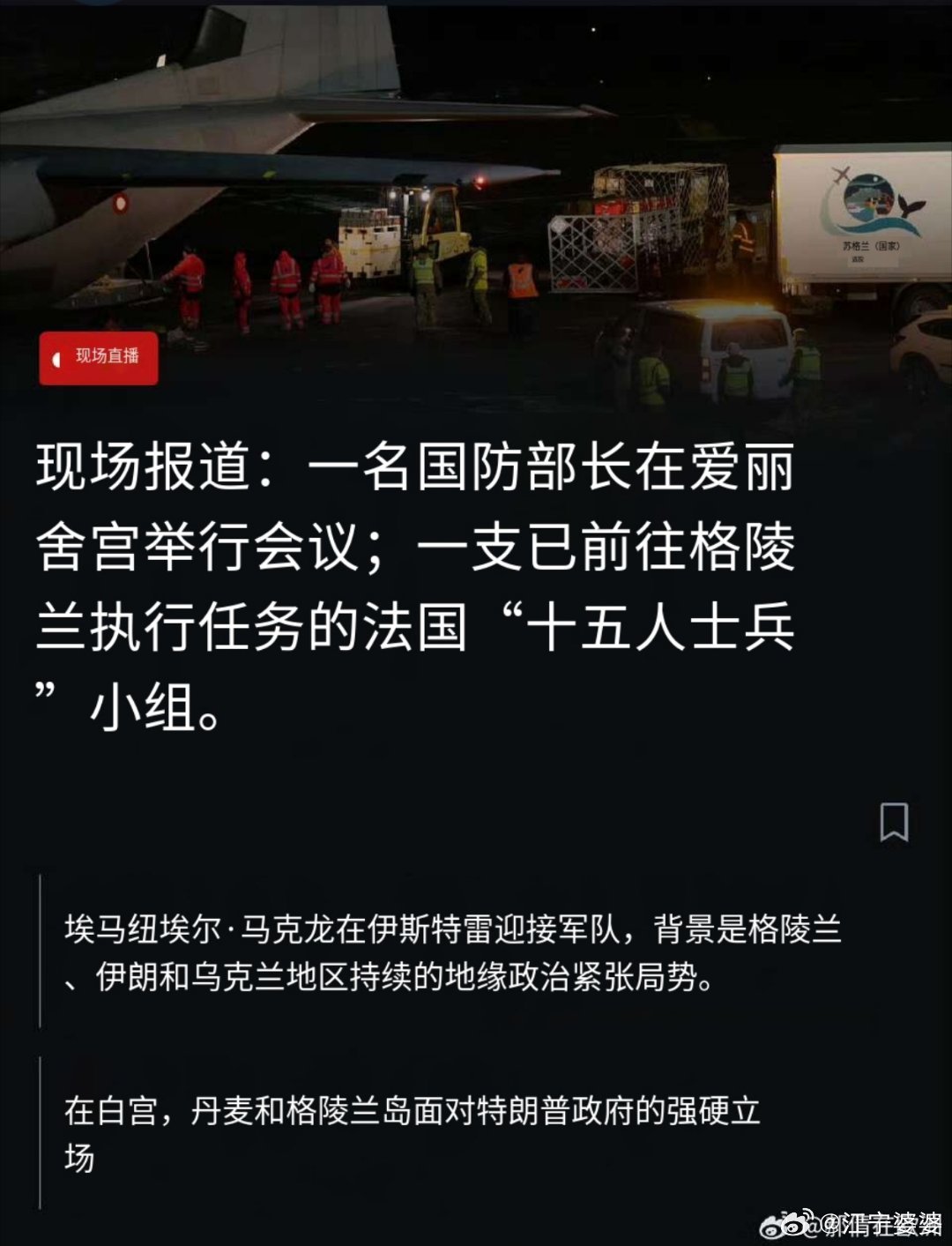 团结的欧洲北约国家已经派出各自的部队准备参加丹麦的军事演习,以此表达团结一致的态度,共同应对美国的可能入侵。目前具体出兵的国家如下:法国:15名军事人员德国:13名军事人员瑞典:不详挪威:2名军事人员英国:1名军事人员客观地说,这个战斗力和我家门口的派出所不相上下,真是一只足以震慑川皇的精锐之师啊