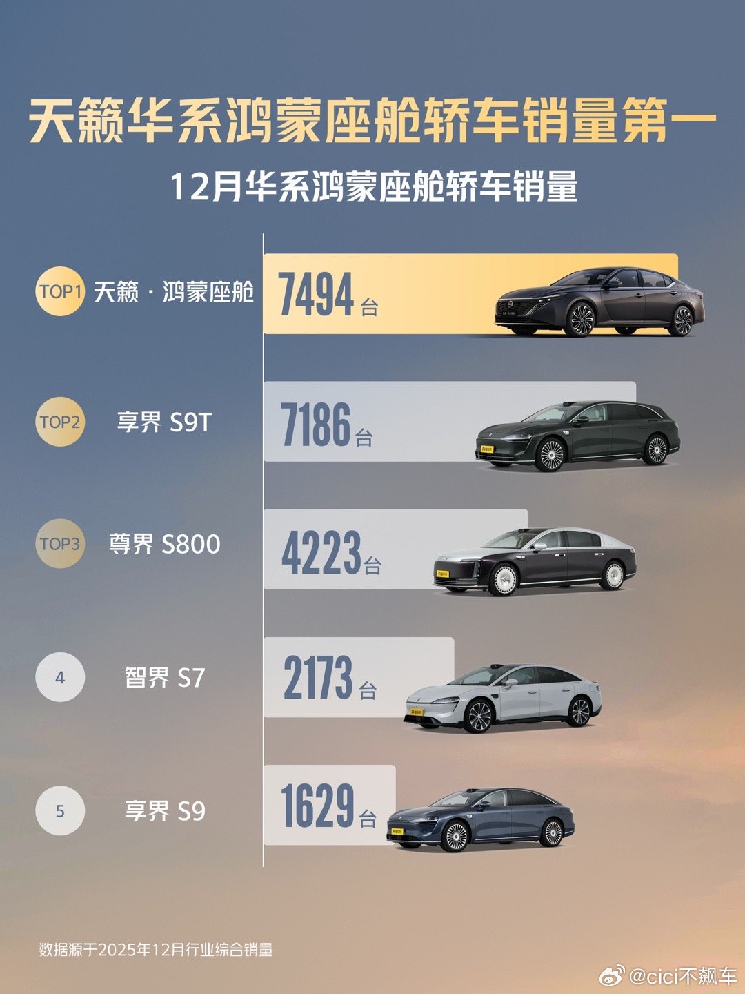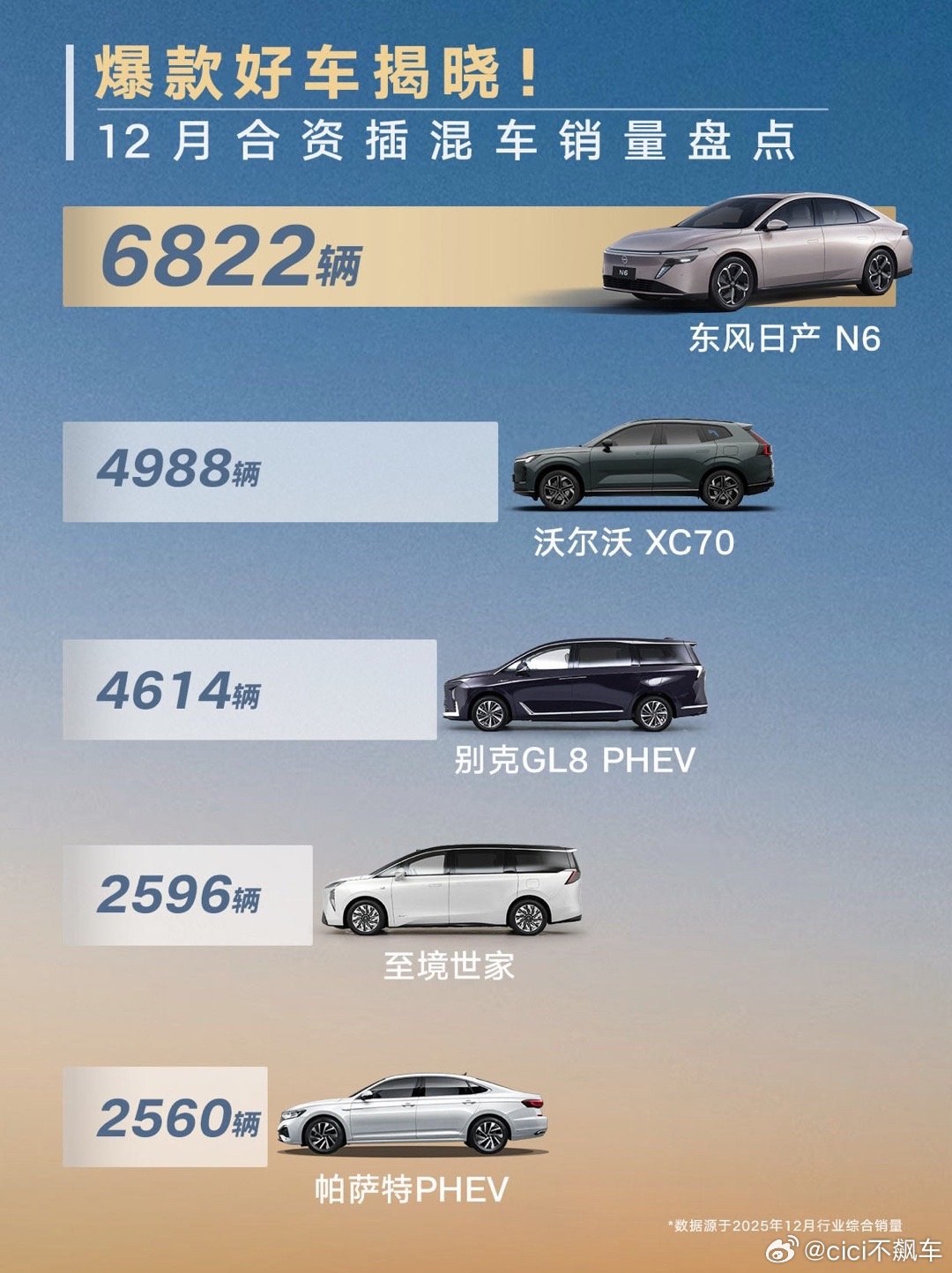 东风日产12月战绩喜人啊,N6 12月卖了6822台,在合资插混车型中销量排名第一!天籁·鸿蒙座舱 12月销量7494台,在华为系鸿蒙座舱轿车销量排名第一销量的成功印证了产品定义的成功,N6的四个2+大小王的产品标签,天籁·鸿蒙座舱的燃油智能第一车产品标签,都是精准的找到了消费者的痛点痒点东风日产真的可以说是给合资新能源打了一个非常成功的样!其实东风日产的成功非常得益于观念上的转变,比如Glocal模式,也就是Global+Local,以日产的全球技术为基础,将研发主导权交给中国团队,产品竞争力和吸引力一下就上来了东风日产的产品基础和群众基础都是很强的,大沙发的舒适,经济省油的口碑,一直都是深入人心的,现在又联合中国本土供应链以及华为鸿蒙座舱生态资源,做到了足够好用足够智能,直接就卖爆了东风日产新能源轿车在2025年已经相当出众了,2026年马上还会推出SUV日产NX8等等车型,东风日产这条合资新能源的赛道一定会继续火爆N6斩获合资插混销量第一天籁斩获鸿蒙座舱轿车销量第一