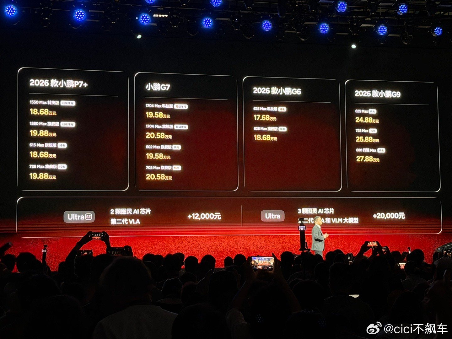 小鹏今天四车齐发~~除了大家都关心的价格,重点是还得是智能技术,大电池、大模型(第二代VLA+VLM)、大算力(图灵AI芯片),小鹏在智能化方面也是一如既往给到了惊喜并且明天2026款小鹏P7+将会在比利时的布鲁塞尔举办上市发布会,期待以后去欧洲旅行可以开上小鹏的车了大v聊车小鹏新年四车齐发2026款小鹏P7+售价18.68万起 广州·小鹏汽车广州总部体验中心