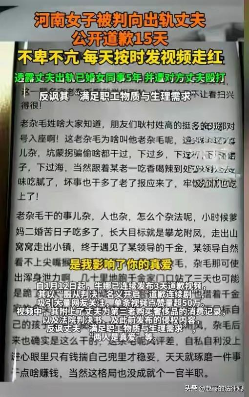 河南洛阳,一女子发现丈夫和已婚女同事有5年的婚外情关系。女子气不过,在社交平台曝光了两人的真实姓名、工作单位,以及消费证据。丈夫不乐意了,将女子起诉到法院,称被侵犯了名誉权,女子败诉后,被法院判处,连续15天公开像其丈夫道歉,女子称知错就改。她每天穿的光鲜亮丽,按时每天发道歉视频,没想到,竟引发热议,因此走红网络。 据悉,牛女士和丈夫高某已结婚17年,两人育有子女。 当年她跟着丈夫,连件像样的衣服都舍不得买。 他们也曾夫妻恩爱,家庭幸福,但在5年前,牛女士意外发现,丈夫和一名女同事关系暧昧。 夫妻间从此有了矛盾,高某对自己女儿的事再也不上心了。 平时不接不送,连学费也不给拿。 家里的房贷不还,对家庭开支更是不管不问。 高某工资1万多,家里花不到他的钱,却给第三者买了2000多块的羽绒服,和多件奢饰品。 牛女士陷入孤立无援,她忍声吞气,想换得丈夫回归家庭。 然而她想错了,她却发现自己的软弱,换来的不是丈夫的惭愧和悔过,而是他的变本加厉。 牛女士发现,婆家人几乎都知道丈夫家外有家的事,只瞒住了她一个人。 牛女士气愤不已,将事情的来龙去脉,以及丈夫出轨的事,发到了家族群里。 没想到,群里一名自称长辈的人站出来说话,他没有对犯错的高某指责,也未安慰一个深受其害的晚辈女子。 而是指责牛女士不该把自家的丑事发到家族群里,自己的事应该自己解决。 并且让他多考虑丈夫的名声,婚姻出了问题,让她在自己身上找原因。 还称群里有晚辈,乱说话会影响家族的和谐,没等她解释,就被踢出了家族群。 其实,这种家族群呆不呆都可以,然而事情的发展并非这么简单。 牛女士的手机里存有丈夫轨出的某些证据,因此她曾多次遭到丈夫的殴打,并摔了她的手机。 牛女士的头上、身上,留下了多处淤青和伤痕。 她终于无法忍受,将丈夫和女同事发生婚外情的事,以及她拿到的所有证据。 以及丈夫和女同事真实的姓名、单位,发布到社交平台。 并连续发布,包括各种细节,以及丈夫给对方买衣服、其他奢侈品的详细消费记录。 因为细节太过明显,给他的丈夫带来了名誉上的损害。 高某急眼了,将牛女士告上法庭,说她侵犯了自己的名誉权、隐私权,要求其公开道歉。 法院认为,牛女士发布在平台的内容太过详细,超出了正常监督的范围。 就算事情是真实发生的,她也拿得出证据,但仍然构成了对高某的侵权。 法院因此判决,牛女士连续15天,公开对高某道歉,但并未限定道歉的具体形式。 也就是说,牛女士可以在网上以文字的形式公开发道歉内容。 当然,也包括以真人出镜公开露脸的形式,发布视频道歉。 然而谁也没想到,牛女士果然以视频的形式,真人出镜,公开向高某道歉。 并每天一期,把道歉视频拍成了连续剧,一时成为了热点。 2026年1月12日,牛女士的第1条道歉视频,在社交账号公开发布。 他光鲜亮丽,化着淡妆,在镜头前不亢不卑,娓娓道来。 因为发现了丈夫私自挪用夫妻共同财产,内心一时愤怒,发布了丈夫家外有家的证据。 因为内容太过详细,言辞多有不当,公开向丈夫高某道歉。 第2天道歉视频,牛女士称:高某你好,我错了,是我影响了你们的真爱。 并在视频中,附上了丈夫为第三者购买奢侈品的消费记录。 以及被丈夫殴打后受伤的照片,判决书、和此前发布的侵权内容。 截至目前,牛女士已连续4天发布道歉视频,引发了大量网友的关注,视频被大量点赞、涨粉。 同时,牛女士的遭遇也引发了人们的广泛讨论,有人心疼她的强颜欢笑,有人同情她的处境。 但有法律人士认为,牛女士以这种形式道歉,仍有损害他人名誉权、隐私权的嫌疑,有可能再次被对方告上法庭。 那么,从法律的角度来分析,如何看待牛女士的遭遇? 根据《民法典》第1032条:自然人享有隐私权。任何组织或者个人不得以刺探、侵扰、泄露、公开等方式侵害他人的隐私权。 隐私是自然人的私人生活安宁和不愿为他人知晓的私密空间、私密活动、私密信息。 牛女士丈夫的名字、工作单位等信息属于个人私密信息,其婚外情行为也属于私人生活中的私密活动。 牛女士未经丈夫同意,将这些信息发布在社交平台上,尽管是出于气愤和维权目的。 但这种公开行为符合“泄露私密信息”的侵权情形,侵犯了其丈夫的隐私权。 《民法典》第1024条:民事主体享有名誉权。任何组织或者个人不得以侮辱、诽谤等方式侵害他人的名誉权。. 名誉是对民事主体的品德、声望、才能、信用等的社会评价。 牛女士发布的细节,及消费记录等内容,虽事出有因且内容属实,但细节太过明显。 可能会使他人对其高某产生负面评价,降低其社会声誉,降低他人社会评价。 即使牛女士是在维护自己的权益,也不能以侵犯他人名誉权的方式进行。 对此,你怎么看? 关注@赵哥的法律观,明辨是非不上当。