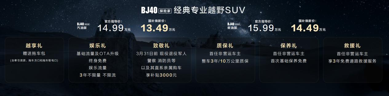 【国补焕新价13.49万元起,北京越野BJ40探险家正式上市】1月15日,北京越野BJ40探险家正式上市,共推出2款车型,售价区间为14.99万-15.99万元,国补焕新价13.49万-14.49万元。外观方面,新车依旧采用经典的五孔式前格栅设计,大灯组与亮黑色中网融为一体。前包围采用越野风格设计,两侧内置红色拖车钩,外侧配备矩形LED灯组。车身尺寸方面,其长宽高分别为4630/1925/1871mm,轴距为2745mm。内饰方面,BJ40探险家标配12.3英寸全液晶仪表并搭配三辐式多功能方向盘,中控中间配备15.6英寸的多媒体触控屏,内置8155车机芯片。新车中控台造型具有较为显眼的越野化设计,例如副驾前方的横置扶手,中控通道区域的银色机械按键等;新车还配备了电子换挡机构以及电子手刹。越野化方面,新车除了标配AT轮胎外,还标配后桥电控差速锁、可选前桥电控差速锁、ATS全地形控制系统(4种模式),柴油版还标配底部金属护板。动力方面,BJ40探险家拥有汽油版与柴油版可选,其中汽油版配备2.0T涡轮增压四缸发动机,最大功率165千瓦,最大扭矩380牛·米;柴油版配备2.0T发动机,最大功率120千瓦,最大扭矩380牛·米。【来自懂车帝车友圈】