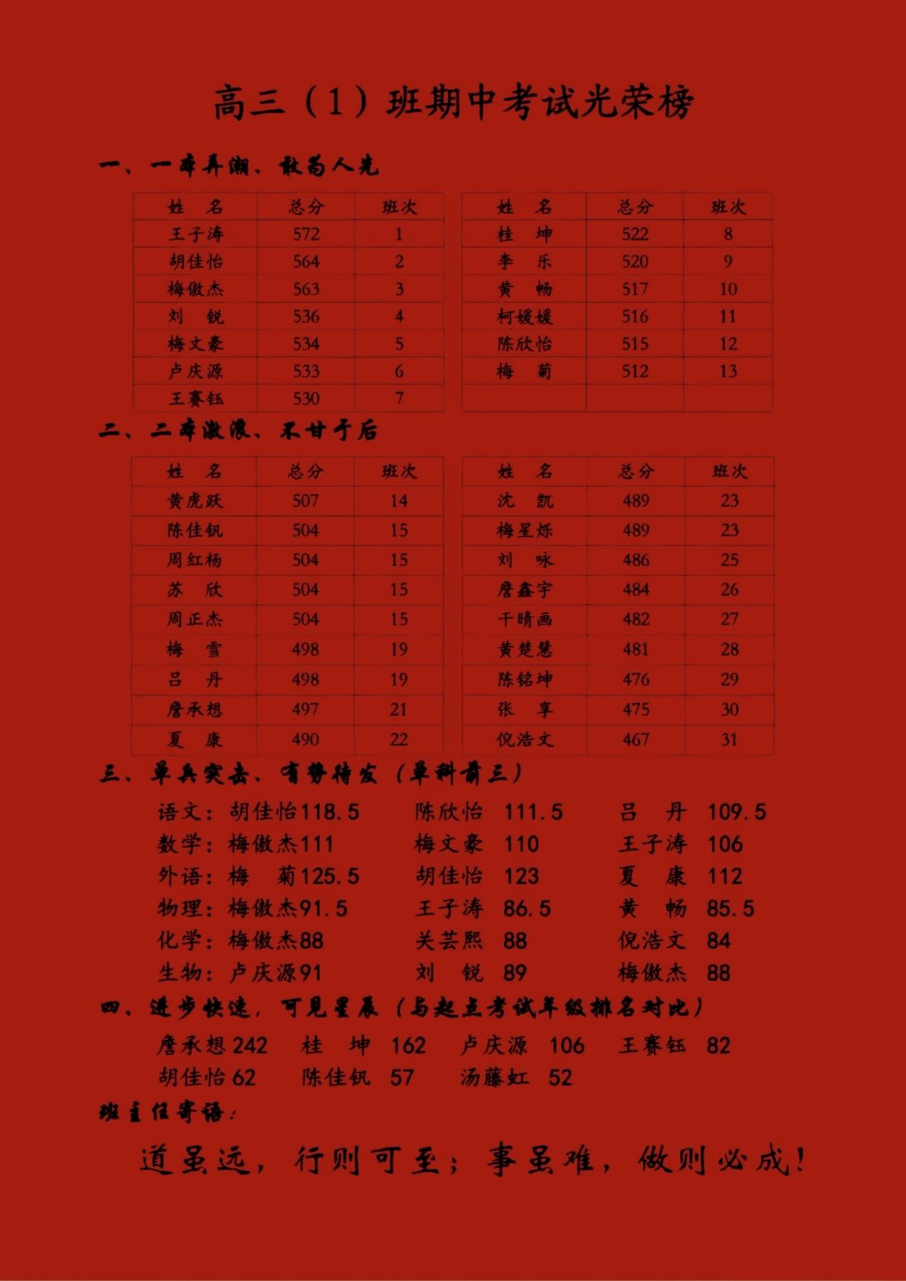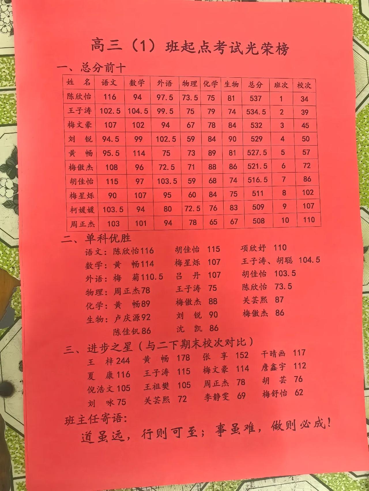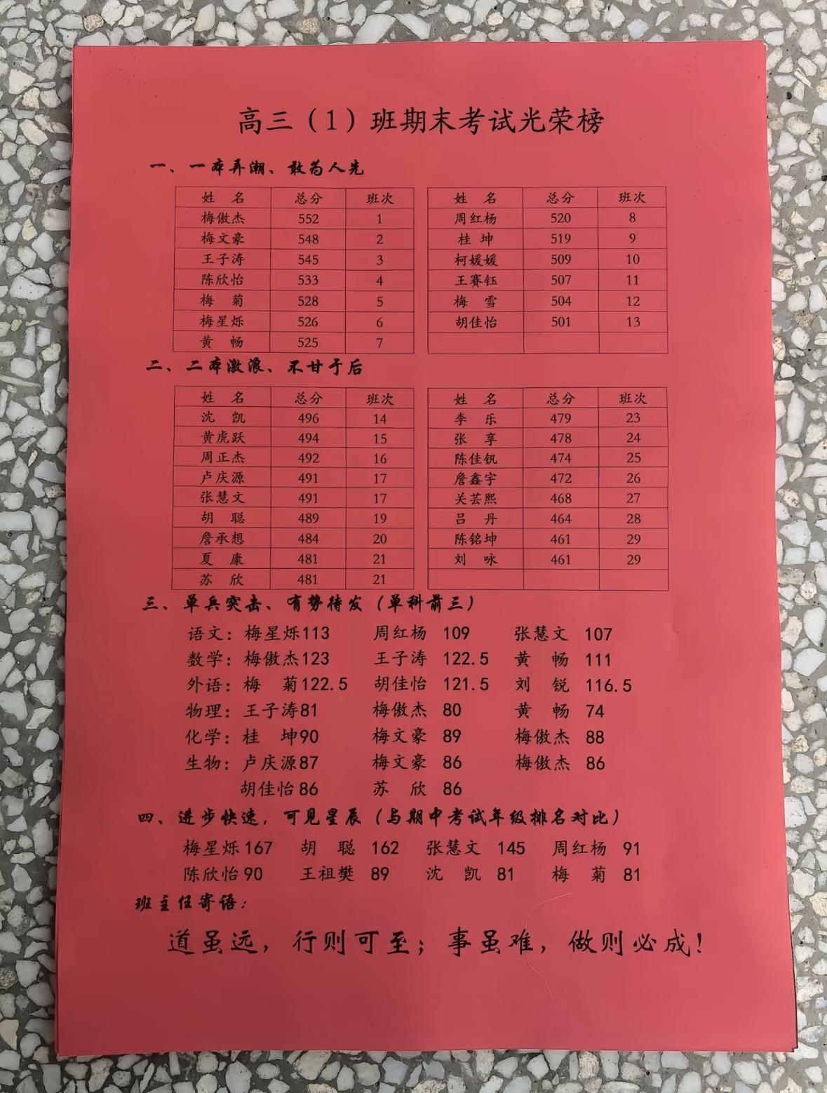 高中1班上学期考试成绩,班级前三名学生成绩升降情况。期初月考成绩第1名陈欣怡537分,第2名王子涛总分534分,第3名梅文豪532分。期中考试成绩王子涛由起初班级第2上升为本级第1,原第1名陈欣怡同学下降第12名,原第3名梅文豪下降到第5名,梅傲杰由班级第6名上升为第3名。期末考试成绩班级第1名梅傲杰,成绩一直上升从第6到第3再到第1名,第2名梅文豪期中下降第5后又追回第2名,第3名王子涛成绩一直前三很稳定。高三1班上学期考试成绩