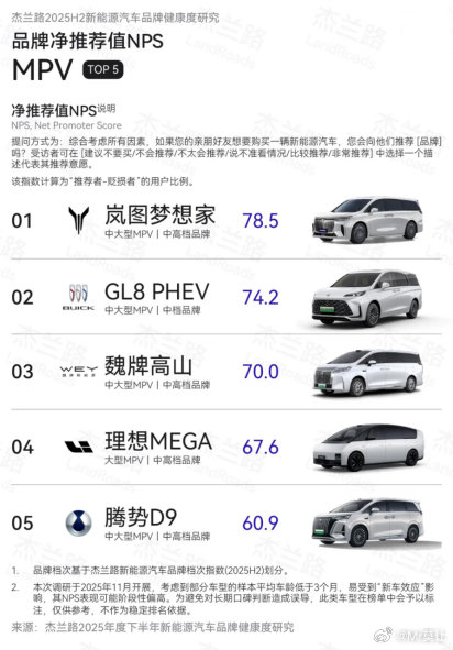 岚图梦想家在2025年销量为80,248台,同比增长46%,蝉联高端MPV销冠与用户口碑(NPS)双第一。均价超40万的高端MPV车型意味着集合了空间、安全、补能便利性,以及智能科技。不仅是车,更是一种价值认同。高端MPV销量冠军岚图梦想家