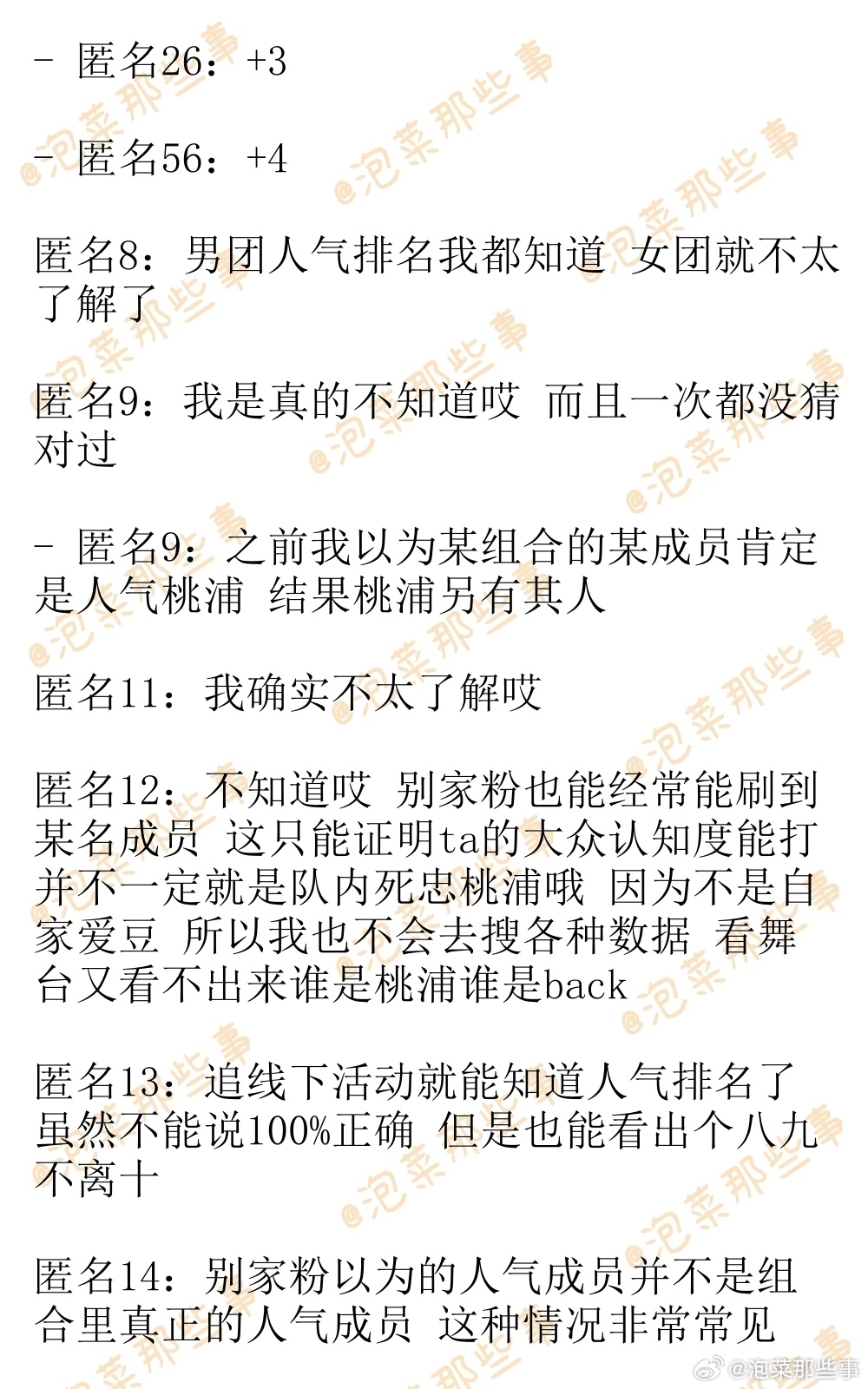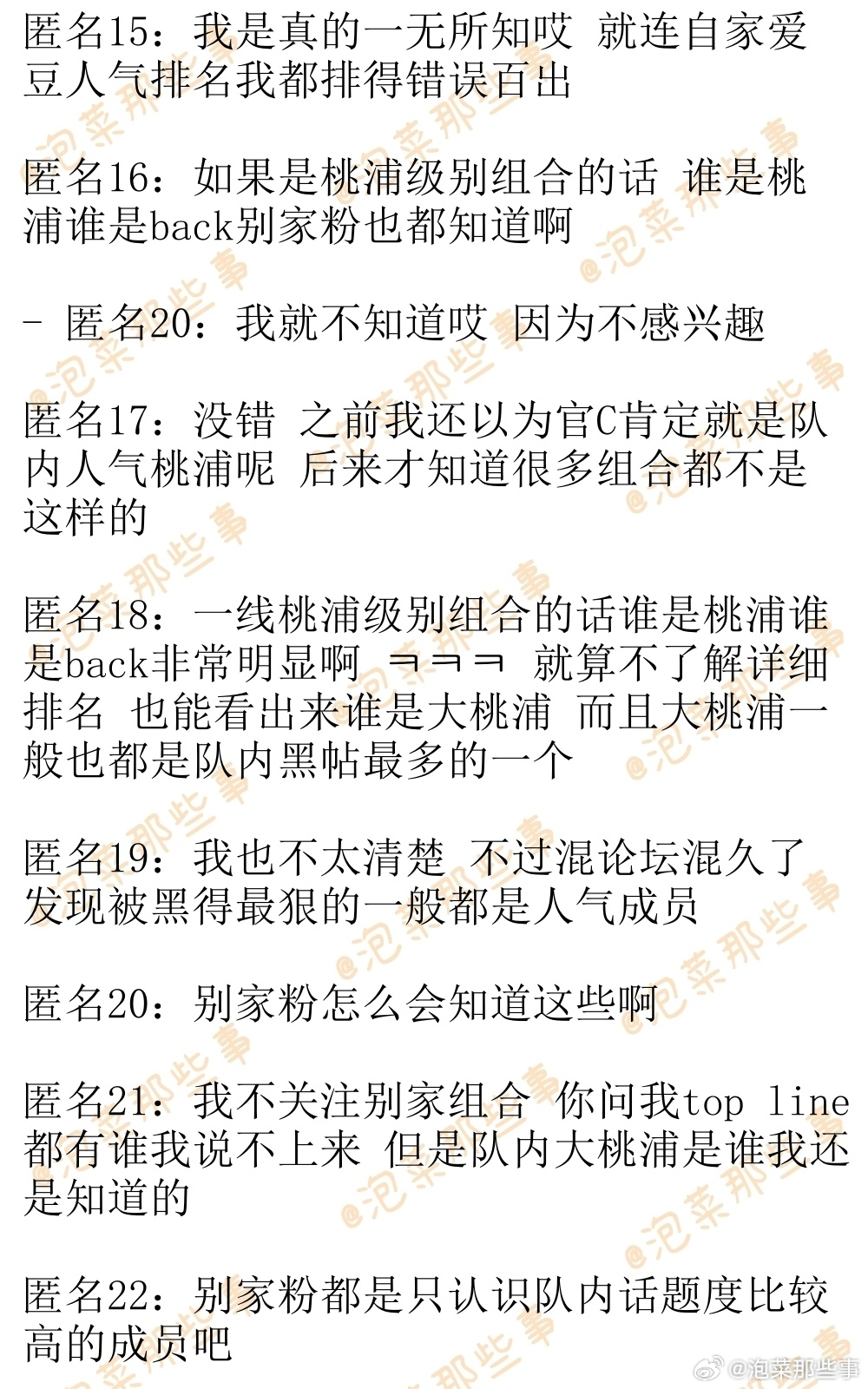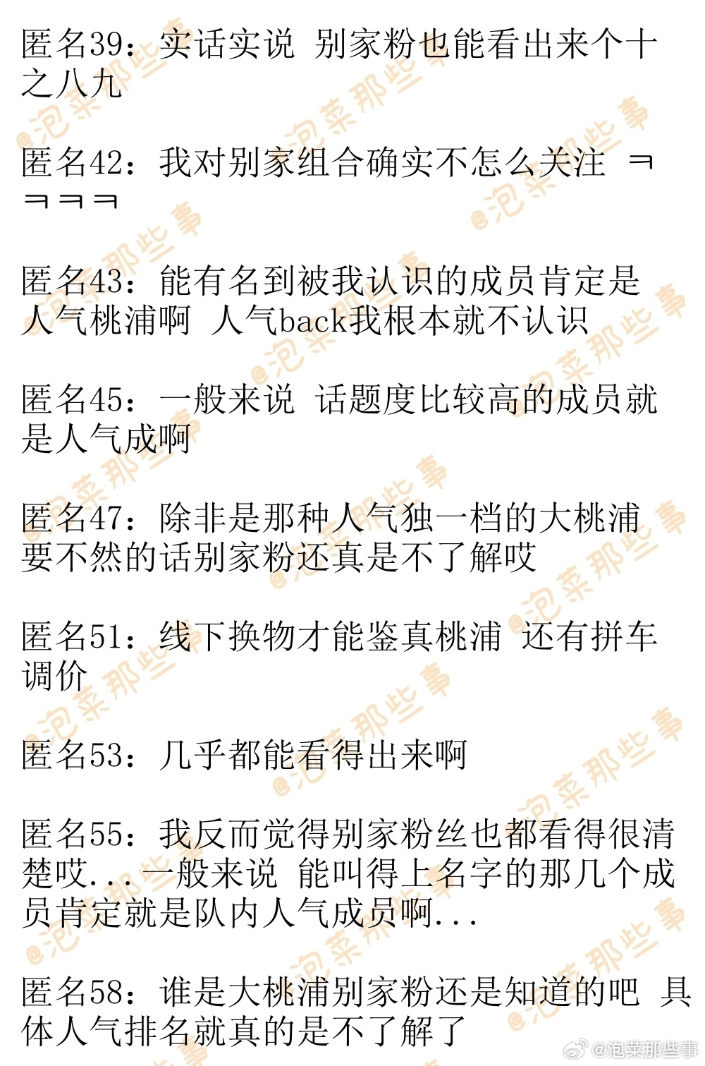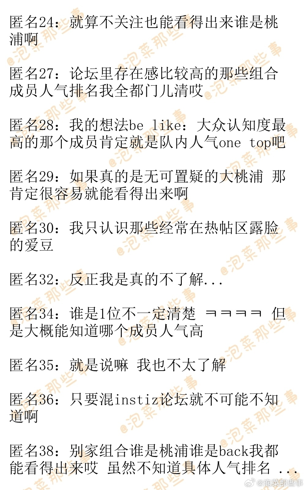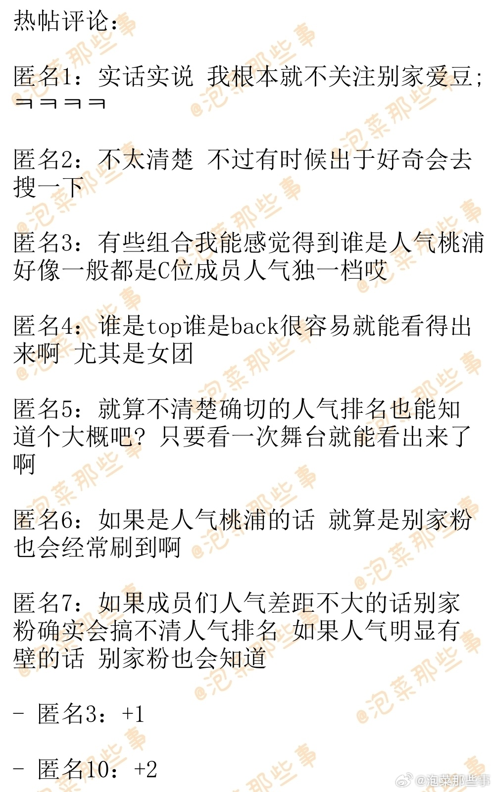 🔥韩网热帖评论翻译🔥组合里谁是人气桃浦谁是back别家粉都不太了解吧?韩网原帖帖主发问:组合里谁是人气桃浦别家粉都不太了解吧? 肯定都不怎么清楚吧 只有自家粉丝才清楚知道谁是队内人气1位 调价直拍播放量周边销量这些别家粉丝根本就不会去看啊 又不是自家爱豆 所以应该不会去关注这些吧...ㅋㅋㅋㅋ cr.instiz