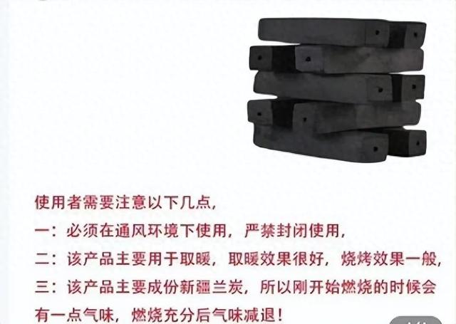 金女士提供的购买凭证显示,她购买的那箱烧烤炭重约20斤,实付28.65元。该烧烤炭的使用须知称,必须在通风环境下使用,严禁封闭使用,主要用于取暖,“取暖效果很好,烧烤效果一般,刚开始燃烧时会有一点气味,燃烧充分后气味减退。”