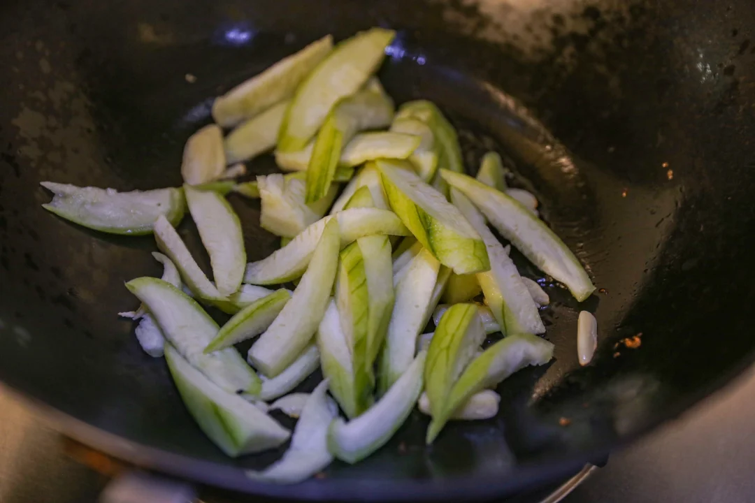 丝瓜去皮,从中间一分为二,然后斜刀切成厚片状态。
