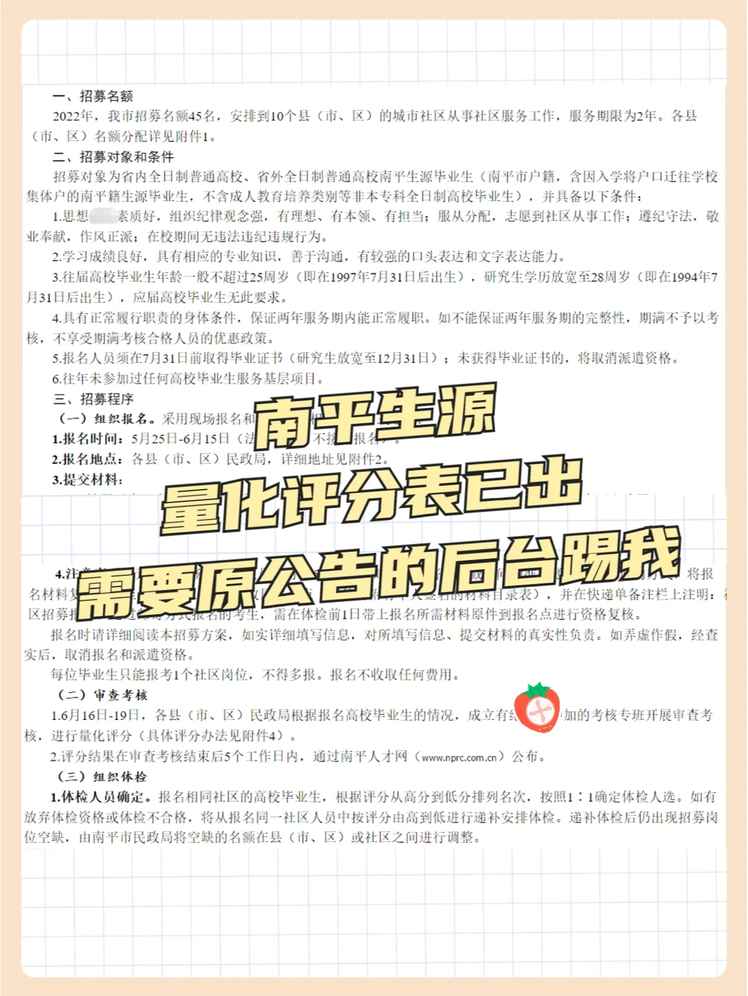 2022南平高校毕业生服务社区公告发布: 报名时间:5月25日-6月15日 招聘要求:南平生源 报名方式:现场或邮寄 考核方式:量化评分 考核时间:6月16日-19日