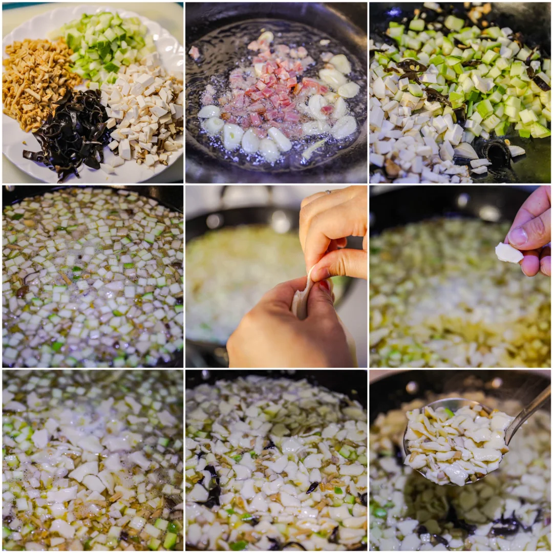 🌟1.火腿切丁儿,葱姜蒜爆锅炒一下,加入一些喜欢的蔬菜,翻炒香味之后加入热水。
