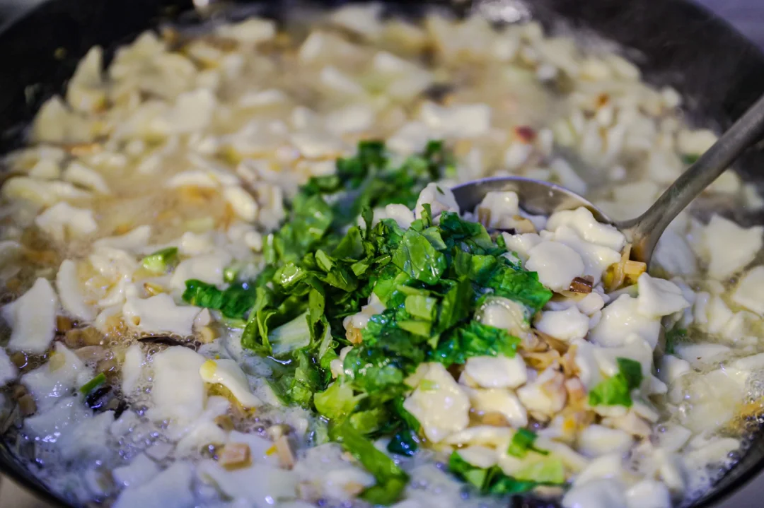 🌟5.然后大拇指和食指边掐边捻成小片片状,下到锅中,煮到完全都漂上来熟了即可。