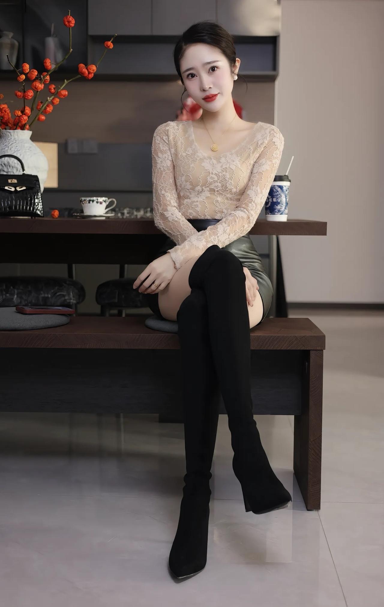 优雅蕾丝连衣裙,搭配黑色长靴,尽显都市女性魅力!👠💃