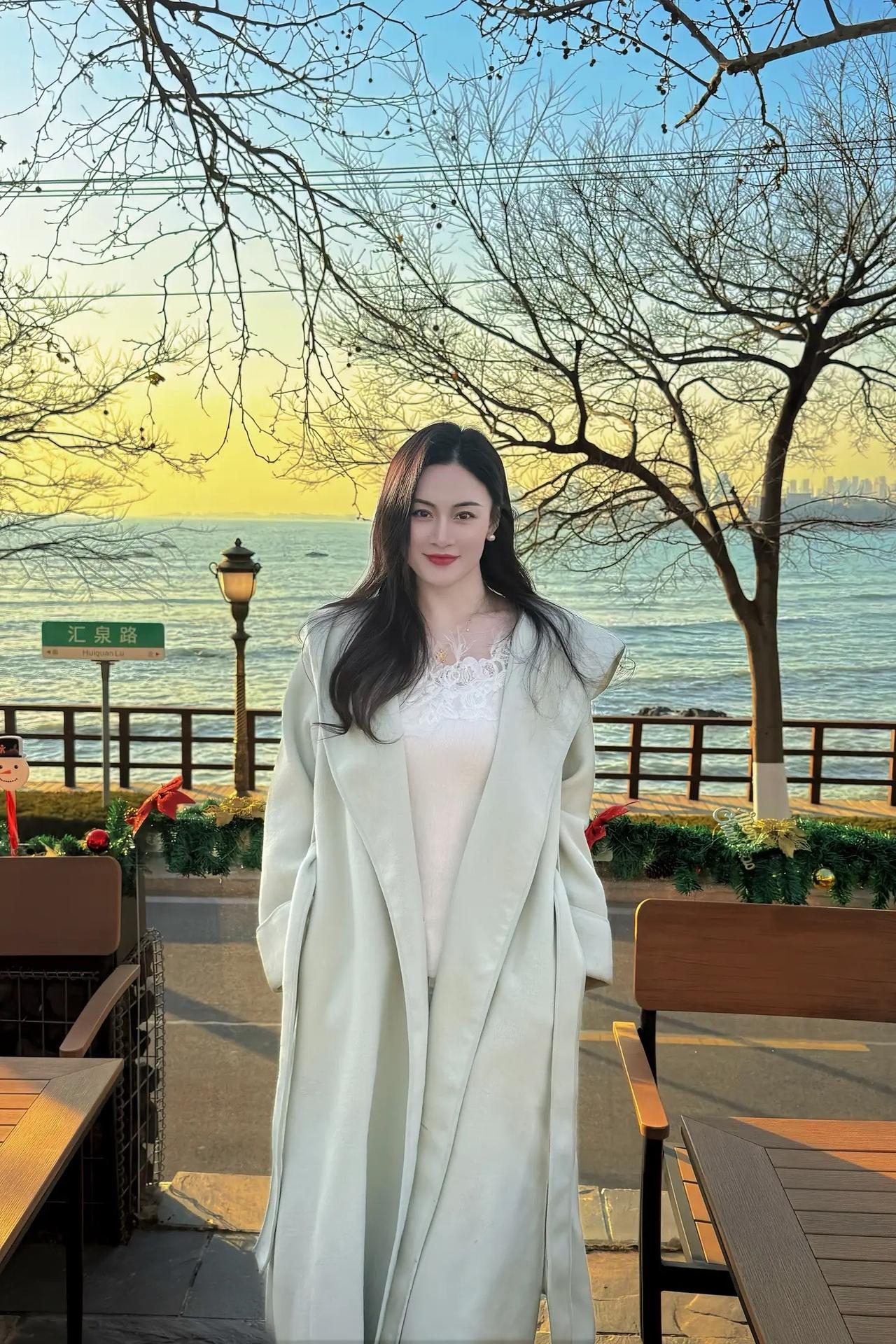 冬日暖阳下,优雅的白色大衣与海边的浪漫邂逅。