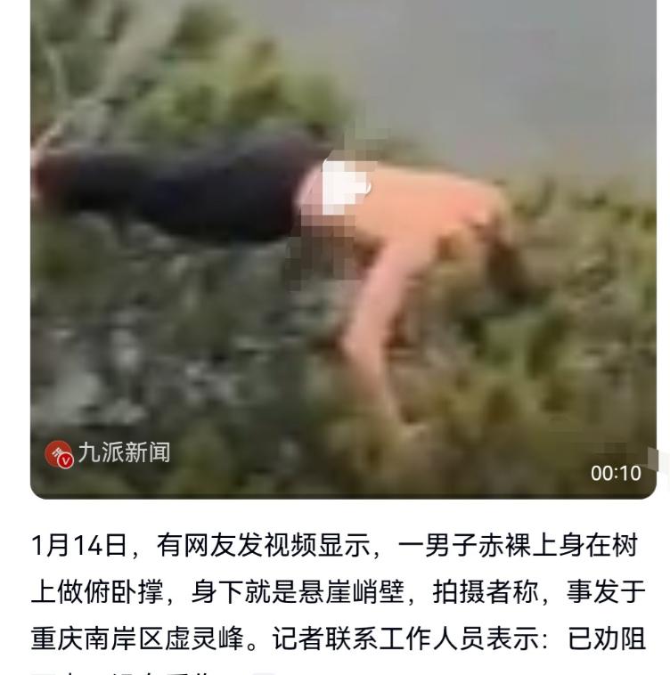 重庆,一名男子在悬崖边趴在树上做俯卧撑,被人拍成视频发到网上,引起关注。当地街道办事处在接到反映后,将男子劝离。男子回应,自己从小就坚持运动,也有分寸,但劝大家不要模仿。 最近几天,重庆南山风景区虚灵峰的一段视频把网友们都惊到了。 视频的拍摄时间是2026年1月14日,画面里的场景让人一看就忍不住攥紧拳头,悬崖边一根向外探的细枝上,居然趴着个赤裸上身的年轻男子,还在稳稳当当地做俯卧撑。 细枝下方就是几十米深的悬崖,岩壁光秃秃的没有任何遮挡,男子每一次俯身、撑起,树枝都跟着剧烈摇晃,仿佛下一秒就要断裂。 这段惊险的画面是同行的游客偶然拍到的,有人说当时现场不少人都看呆了,没人敢出声提醒,生怕惊扰到对方导致意外。 视频被传到网上后,很快就冲上了热搜,评论区瞬间被网友的讨论填满。 最集中的声音就是不敢置信,很多人直言“第一眼以为是AI做的特效”,毕竟在悬崖细枝上做俯卧撑,已经超出了正常户外行为的范畴。 更多网友则是担忧和质疑,有人说“隔着屏幕都腿软”,也有人直接发问:“这到底是为了锻炼,还是故意拍视频博流量?” 就在网友热议的同时,属地街道办事处已经接到了群众的反映,工作人员没耽误,立刻赶往虚灵峰现场处理。 赶到现场时,这名男子还在树枝上停留,经过工作人员的耐心劝说,他最终安全爬下树枝,全程没有出现意外。 据街道办工作人员后续说明,这名男子是外地来重庆爬山的游客,之所以做出这种危险动作,就是想拍一组特别的照片,拍完就准备离开。 针对这件事,工作人员也明确表态,后续会在虚灵峰这类险峻区域增设巡查人员和警示标识,同时也希望所有游客能绷紧安全这根弦,别为了新奇体验冒险。 视频里的男子姓袁,不少网友也叫他“源神”,是个常年热衷于户外运动的人。 面对媒体采访,袁先生提到自己从小就坚持运动,体能基础一直很好。 至于在悬崖树枝上做俯卧撑,他觉得没什么可担心的,自己早就摸清楚了那根树枝的承重,整个动作都在自己的掌控范围内。 不过他也特意强调,自己的情况比较特殊,普通人绝对不能模仿,万一摔下去后果不堪设想。 但袁先生的解释,并没有让网友的质疑平息,反而让“为流量博眼球”的讨论更集中了。 有网友直言,现在社交媒体上,靠危险动作博眼球的案例太多了,越是惊险的内容越容易火,袁先生选择在悬崖这种地方做俯卧撑拍视频,很难不让人往流量上联想。 毕竟正常锻炼完全可以找健身房、运动场,没必要特意跑到悬崖边的细枝上,这种场景本身就自带话题性,拍出来的视频自然容易吸引关注。 还有网友担心的是不良导向,就算袁先生自己有把握,可视频传出去后,难免会有年轻人跟风模仿,到时候一旦出意外,后果就不是能控制的了。 在大家看来,追求个性、记录生活都没问题,但前提是要把安全放在第一位,不能用自己的生命安全去换流量和关注。 当然也有少数网友觉得,袁先生能有这样的体能确实厉害,热爱运动的态度值得肯定。 但这种肯定也仅限于体能本身,大家普遍认为,锻炼的核心是强身健体,脱离了安全前提的运动,早就偏离了初衷。 直到现在,关于这件事的讨论还没停,而大家争论的核心,其实就是在流量时代,该如何平衡自我表达和安全边界的问题。
