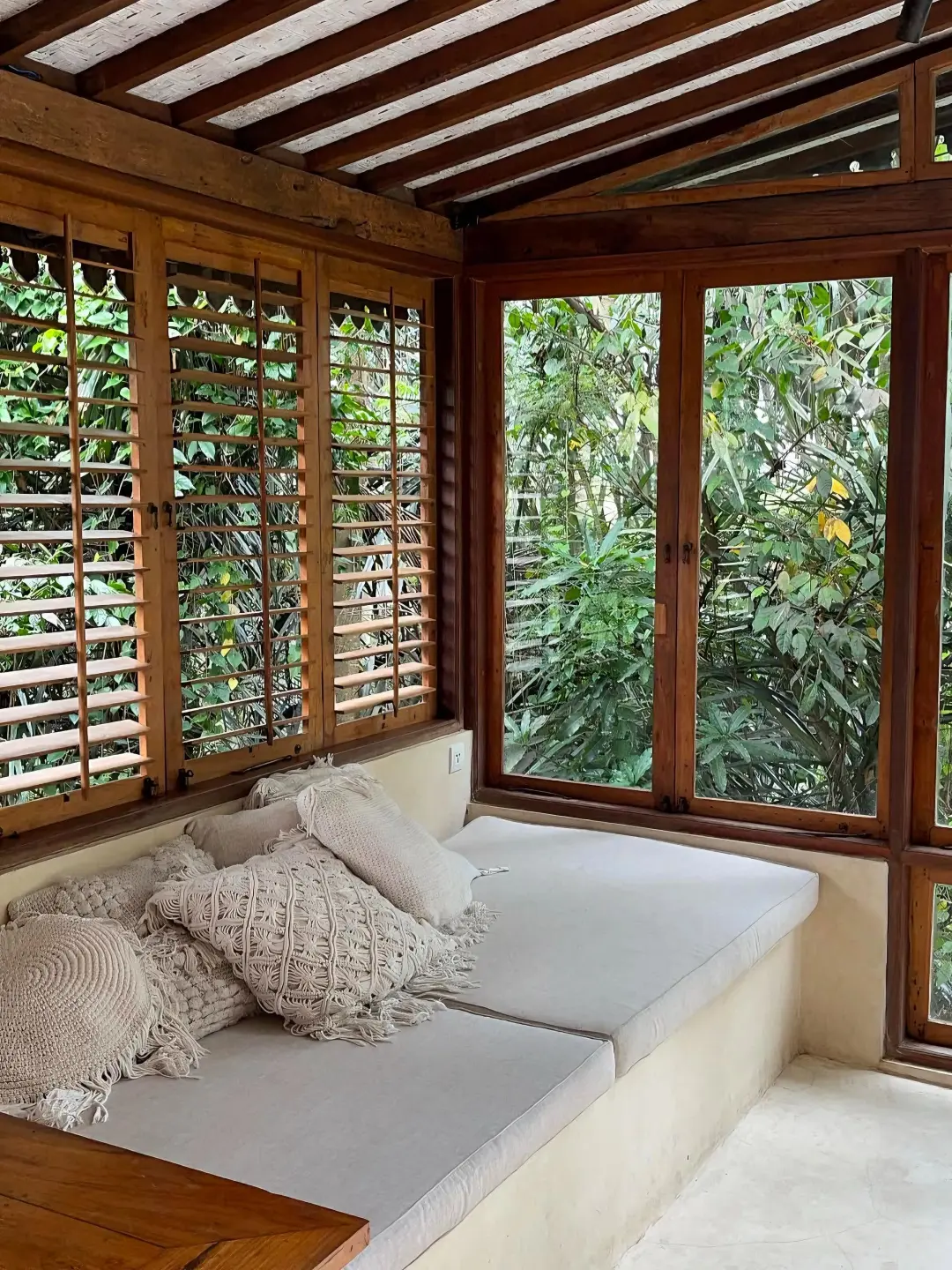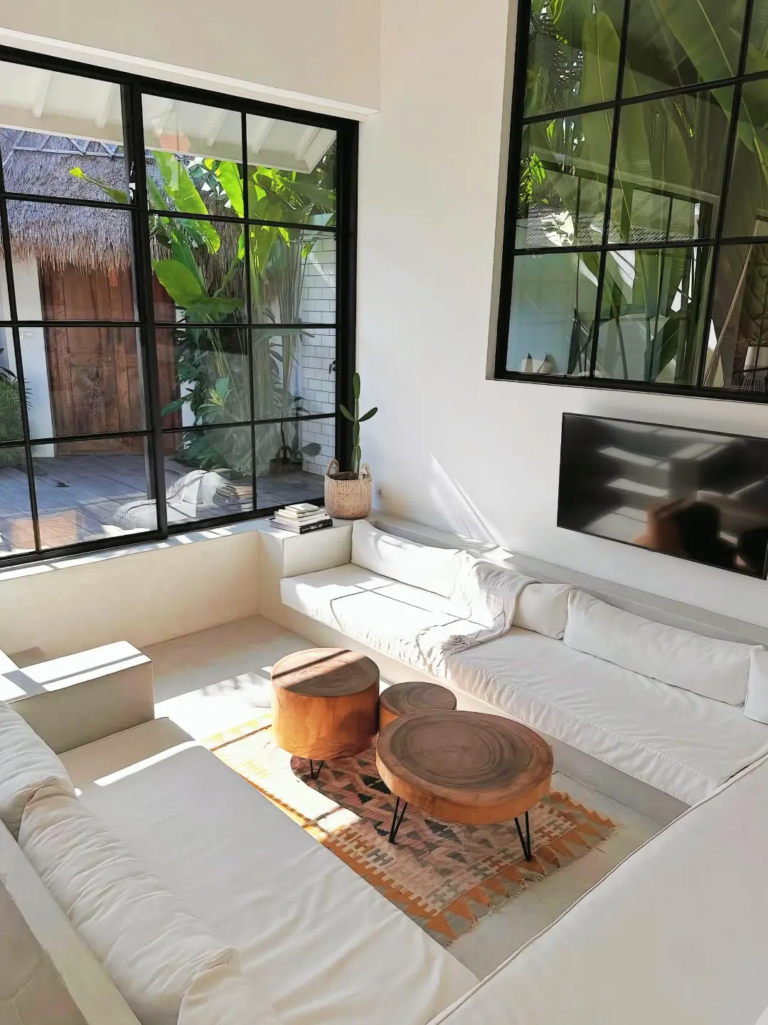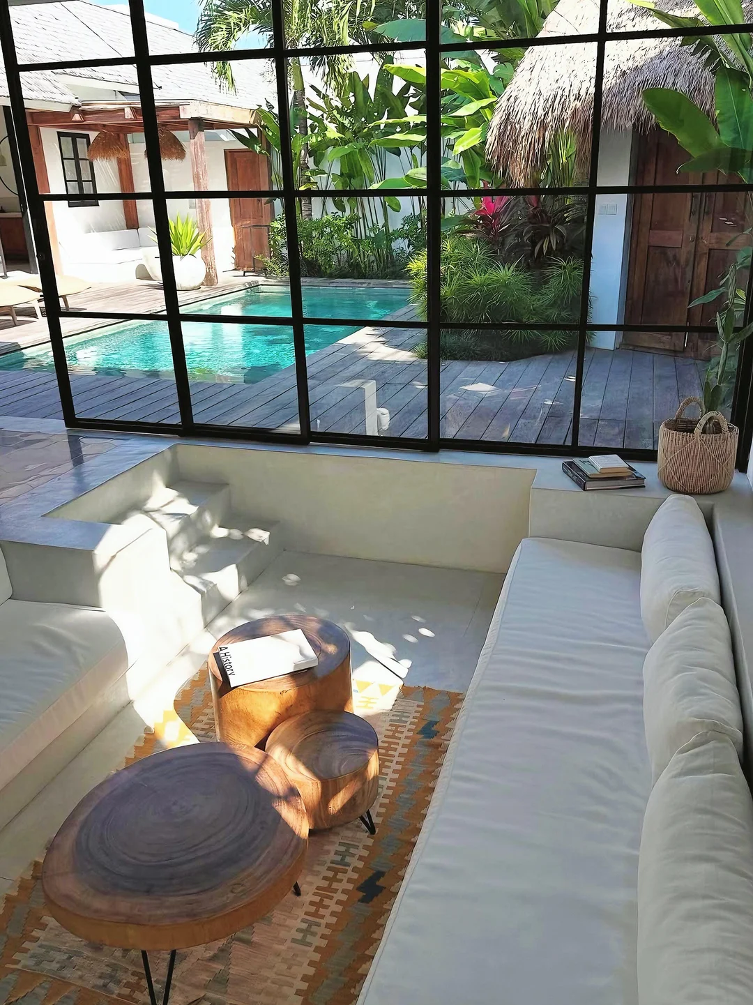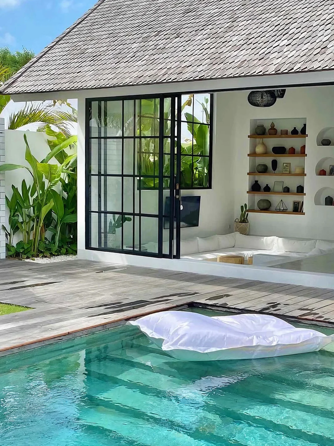 -民宿设计的超级美,最大的亮点莫过于明亮的落地玻璃窗,四周芭蕉叶环绕,配有下沉式的客厅