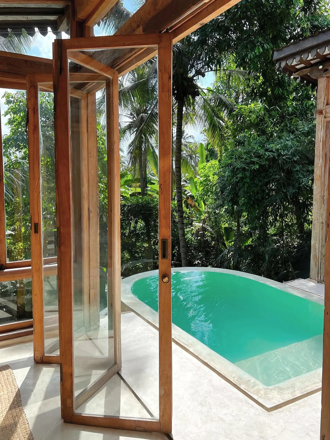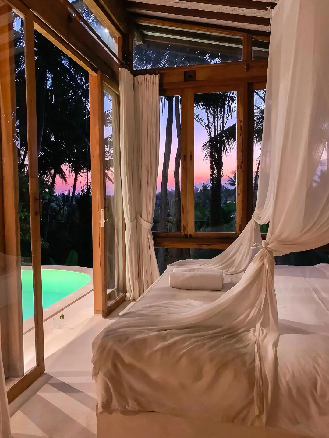-民宿设有私人泳池,泳池对面就是郁郁葱葱的丛林,床品舒适,卧室漂亮宽敞,尤其是屋里的帷幔