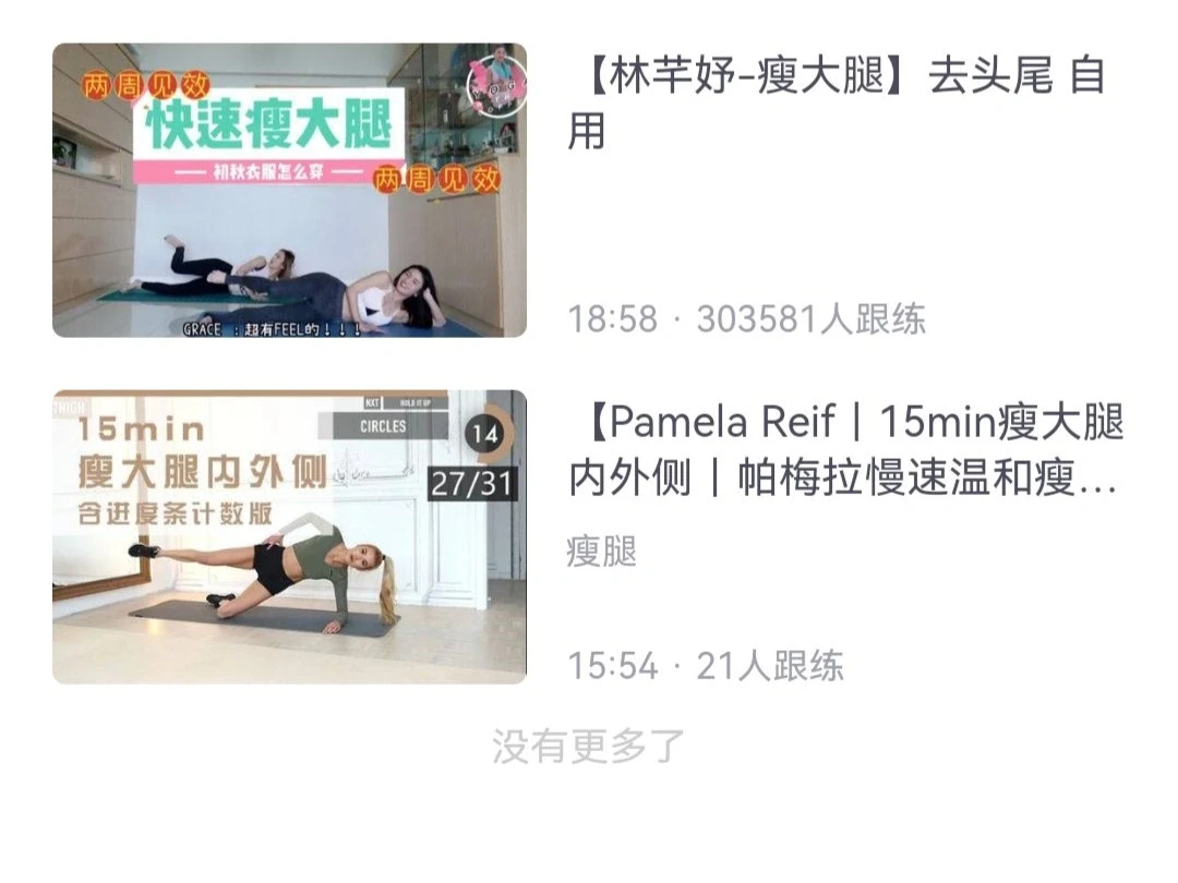 🙋这里我推荐两个跟练视频,初学者可以跟练林芊羽(瘦腿+改善假胯宽[萌萌哒R]),有一点基础的姐妹可以做帕姐的15分钟瘦大腿内侧(我做完两天就有大腿缝了,但腿也是真的酸)