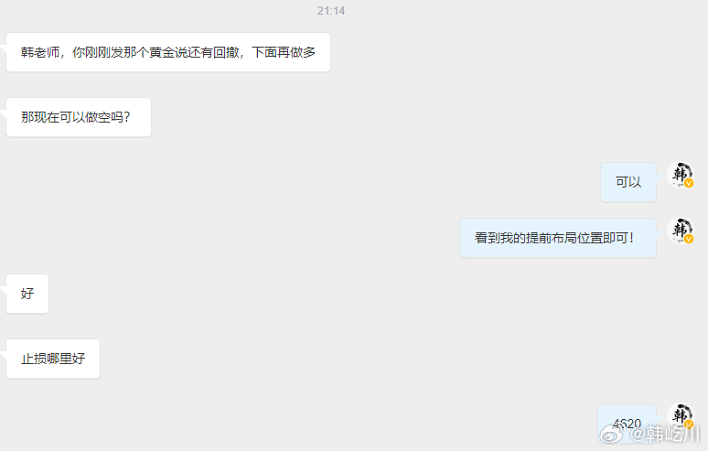 黄金此前安排4612的多单,在涨达4616附近通知大家直接收割!同时研判还有回撤力度,所以提前布局给到4603-4600区间多单等位置进场,那么这里,也是安排盘内短线轻仓反手看了一波下撤,4613下达4603附近收割90余点!其外私信也有粉丝朋友问起,老韩直接回复给到!不过后面到提前布局多单这里,也是遗憾打损一单百点出局!【前策略思路分享且点击链接查看】网页链接 网页链接 回头看看,老韩已经将近有一星期没有出现过一单损失百点的壮景了,收获太多了,单单几乎都是百点以上,还点回去也是应该的!黄金金价