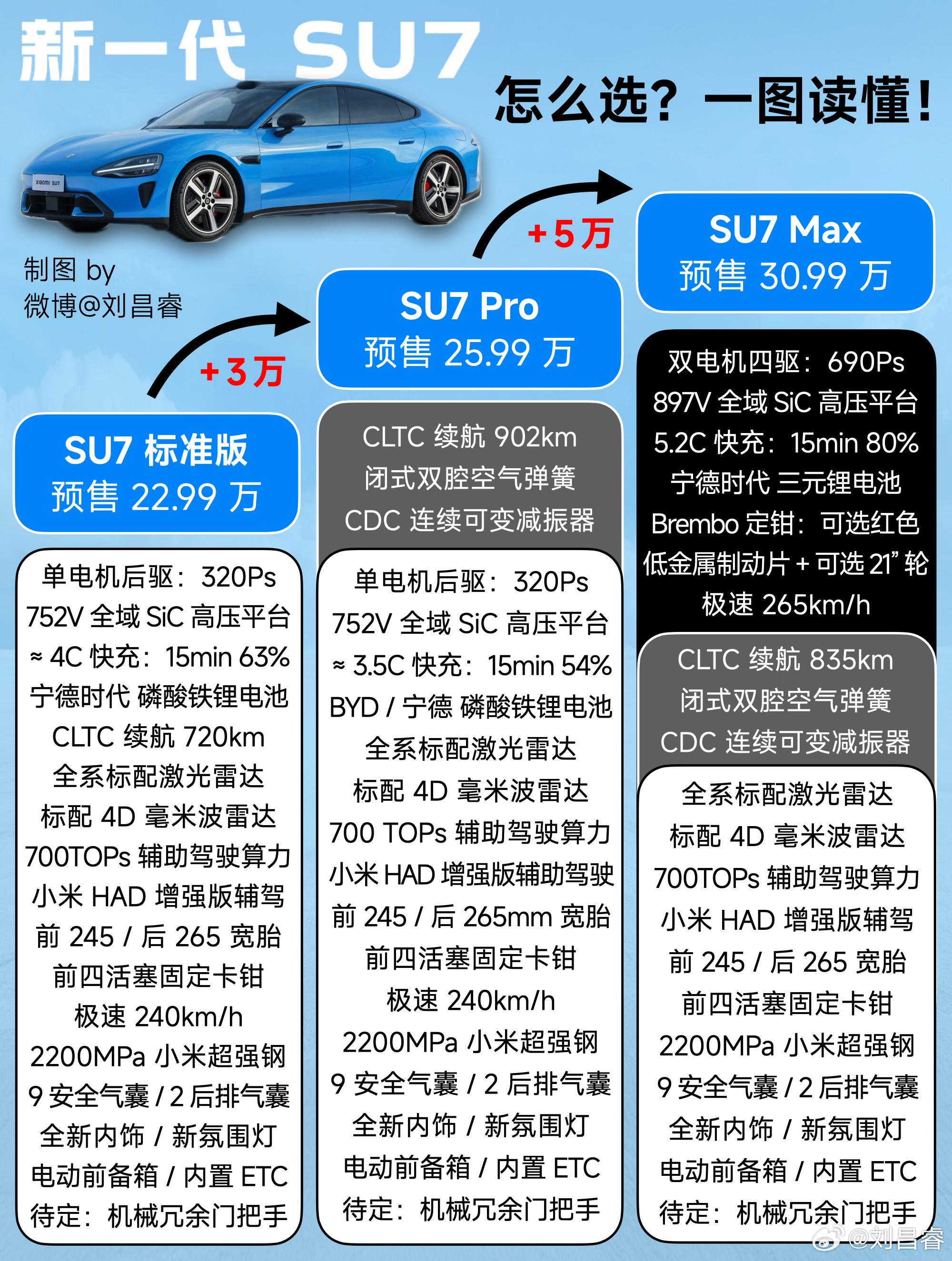 今晚的 大家看了吗?雷总爆料了 的更多信息,我来给大家做总结 首先是轮毂 除了首批官图的 20 英寸锋刃轮毂,上代最标志性的 20 英寸梅花轮毂也得到保留,还新增了非常帅的 21 英寸双层锻造梅花轮毂。另外还有 20 英寸米型轮毂、21 英寸运动轮毂,以及全系标配的 19 英寸钻石轮毂~外饰方面依旧是 9 款车漆(图2)含 3 款专属新色:卡布里蓝和两款待公布新色SU7 有 4 款车漆保留下来:雅灰 / 璀璨洋红 / 霞光紫 / 珍珠白,然后是呼声很高的 SU7 Ultra 同款曜石黑、YU7 同款流金粉内饰方面目前公布了 3 款:除了官图的暗夜黑,还有迷雾紫和暮光红,另外后续还会逐步公布 1 款浅色调内饰和 1 款特殊拼色设计!大家期待新 SU7 吗?喜欢哪款车漆和哪款轮毂?