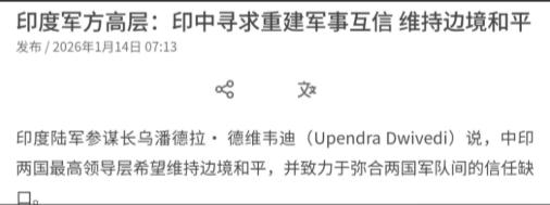 印度主动对我们示好!1月14日,根据外媒报道,印度陆军参谋长乌潘德拉· 德维韦迪表示,中印两国最高领导层希望维持边境和平,并致力于弥合两国军队间的信任缺口。我们正在努力增强两国军队间的互信。包括最高层级、国防和外交部长在内的领导层近几个月已举行会晤。 过去几年边境对峙让双方都得分心应对,现在不一样了,去年中印边境光基层互动就有 1100 次,平均每天 3 次,还重启了边境贸易市场。 边境安宁了,中国就能把更多资源投入到经济建设、科技研发上,不用被地缘摩擦牵扯精力,发展的基本盘更稳。 2025 年中印贸易总额已经冲到 155.62 亿美元的新高,中国的机电产品、印度的矿产品和农产品互补性超强。 印度主动示好后,双方投资和贸易便利化会提升,中国企业在新能源、制造业等领域的合作空间更大,还能借助印度的大市场和劳动力资源,拓宽发展赛道。 中印都是发展中大国,总人口占全球三分之一,在多边机制、全球治理上有很多共同利益。 两国关系缓和后,能在国际上更好协调立场,一起对冲单边主义和贸易保护主义的冲击,为中国发展营造更有利的国际环境。 印度此次主动示好,是中印关系改善的重要信号,但两国关系的真正改善仍需双方相向而行、持续努力。 中印作为拥有28亿人口的两个发展中大国,只有坚持和平共处、互利共赢,才能真正实现"龙象共舞",为地区和世界的和平与发展作出贡献。 以上是小编个人看法,如果您也认同,麻烦点赞支持!有更好的见解也欢迎在评论区留言,方便大家一同探讨。[送心]