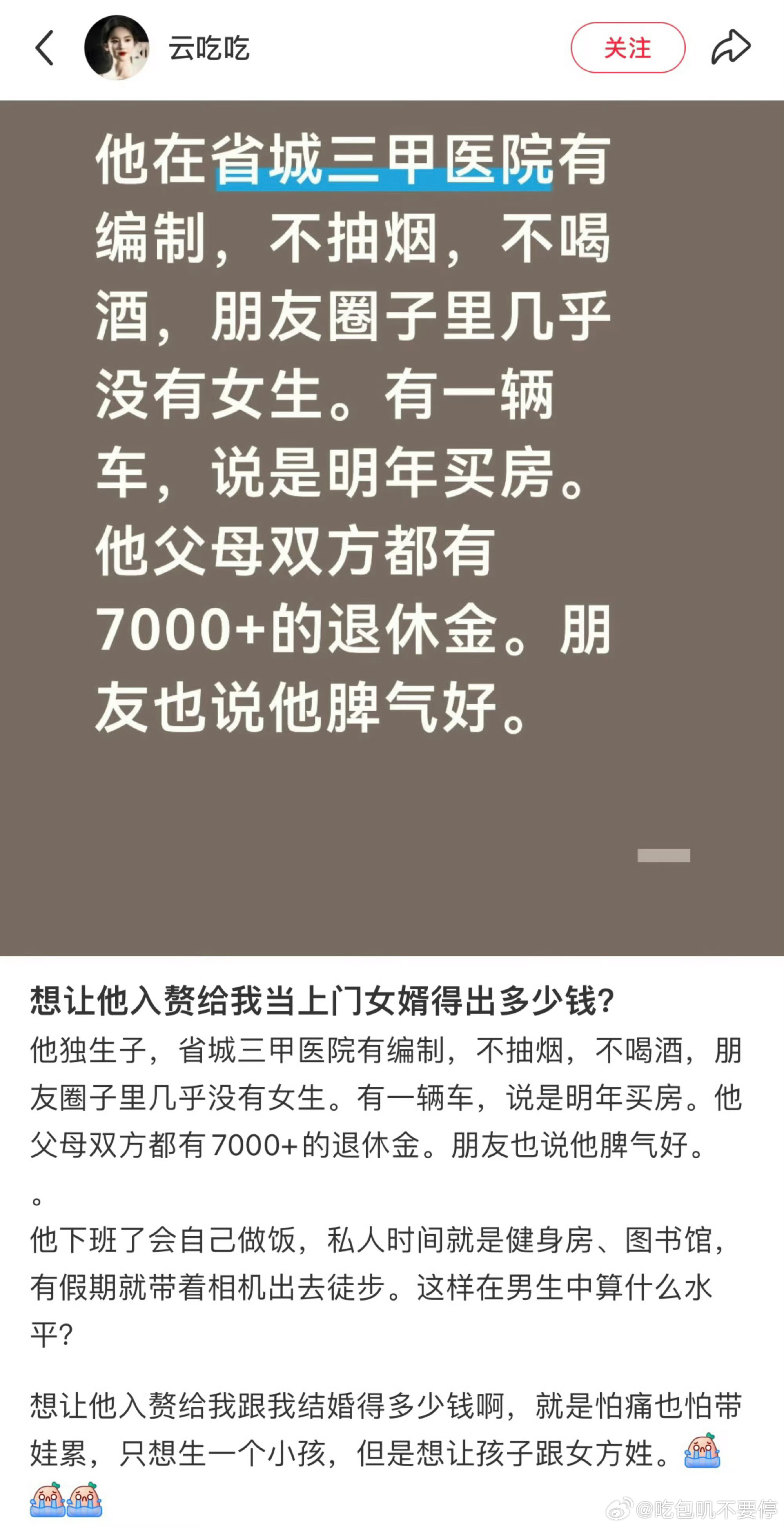 入赘 神帖昨晚看了这个入赘神贴,再次证明一个优秀的男性不过是一个普通女性而已,男的还是太好混了,配德感十足。大家要学习男人的普通且自信。说明结婚在男人眼里就是女方入赘…之前还批彩礼,到了性别反转男的入赘,就要天价彩礼,市长女儿了…真是🐸女方结婚,不止是入赘,还要贡献子宫,让渡孩子冠名权,保姆…不怪结婚率低,慈禧当年多送几个男的出去,就不需要割地赔款了