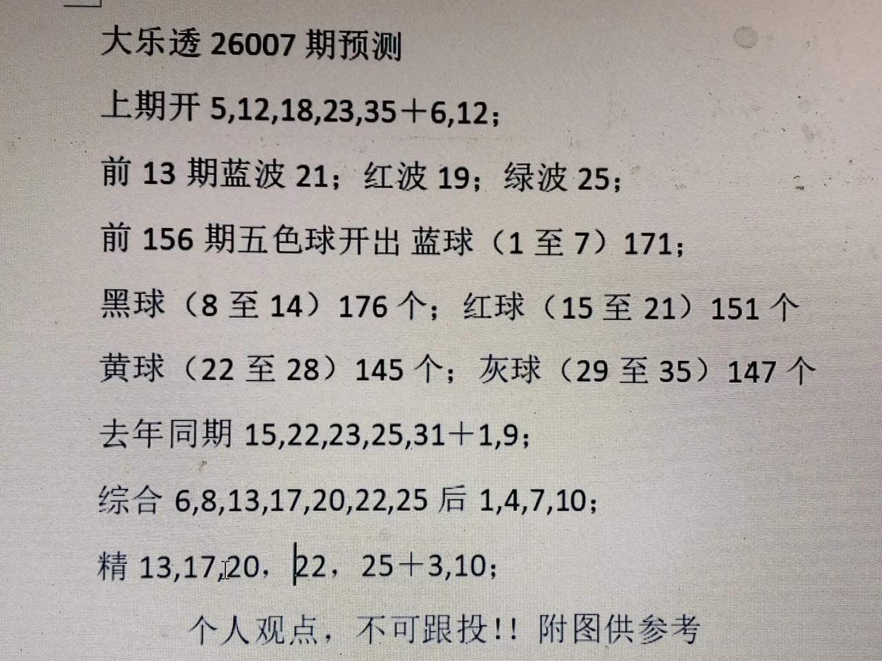 上期前区开出直落23,35。开出第4期三个号5,18,23。5尾连开五期,2尾连开四期,3尾23连开三期,是否还有继续?估计25,13,22,32可能有号开出! 后区上期直落6。全偶数全0路号。多期没开1路号,估计1,4,7,10,5有号开出!