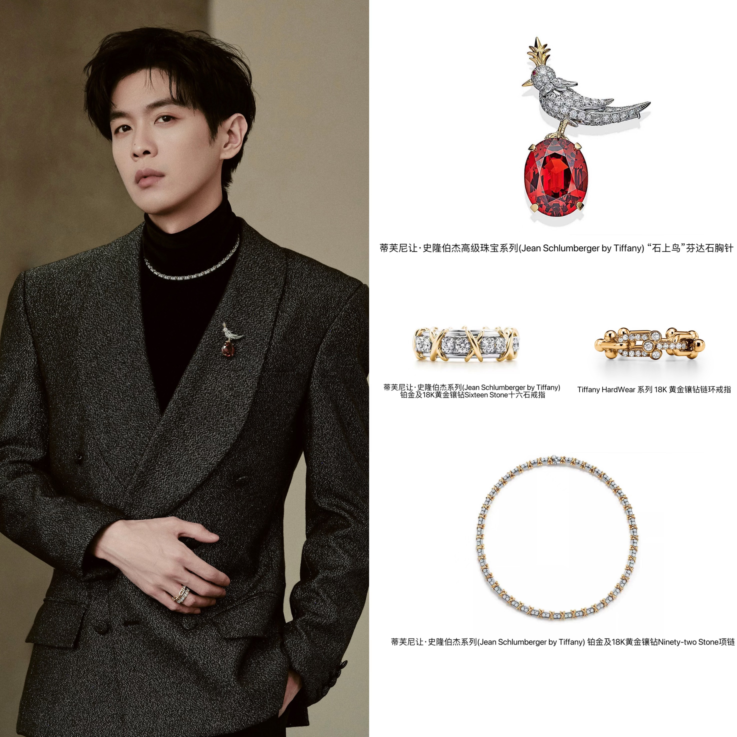 张若昀佩戴蒂芙尼让·史隆伯杰高级珠宝系列(Jean Schlumberger by Tiffany) “石上鸟”芬达石胸针,搭配让·史隆伯杰系列(Jean Schlumberger by Tiffany) 项链、戒指及HardWear系列戒指,闪耀亮相蒂芙尼上海前滩太古里精品店,以摩登之姿彰显自信风范。时尚灵感解读