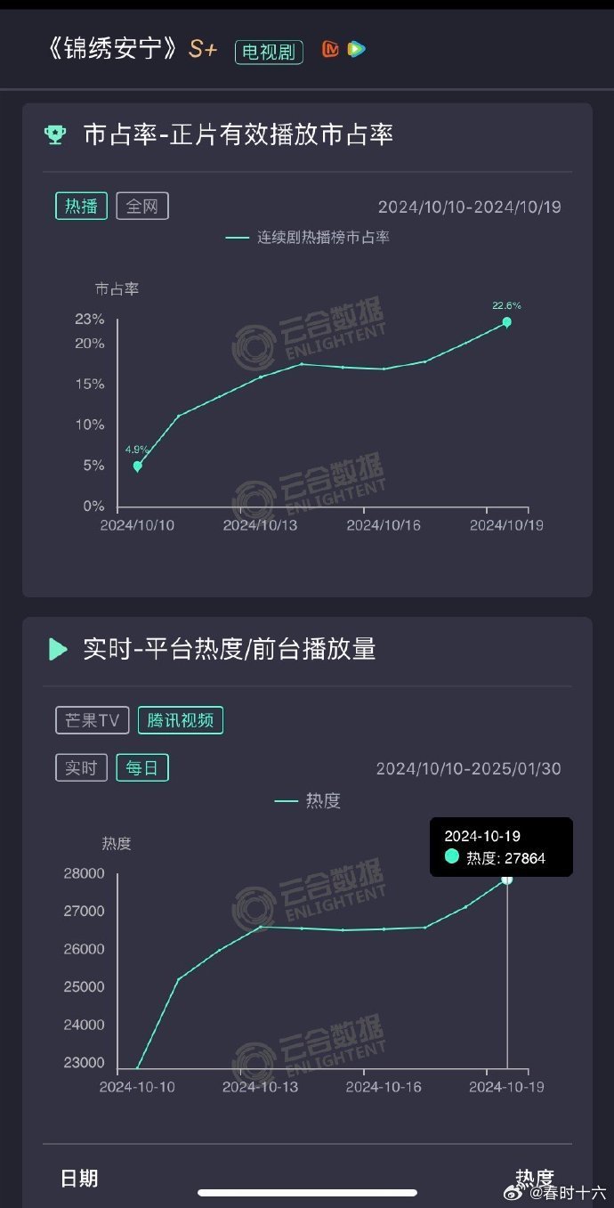 锦绣安宁在云合集中均播放量已突破1500万,热度高达27800,远超同期新剧。预计热播期将达到2500-3000万,已超过S+级古偶柳舟记的1995万播放量。作为一部S级古偶,表现超出预期。主演之前并未出演过爆款剧集,也不是流量明星,但播出效果如此出色,至少没有辜负平台的信任。后续剧情还有几个高潮,如果保持良好势头,有望突破3000万。目前已有底气摆脱扑街命运。
