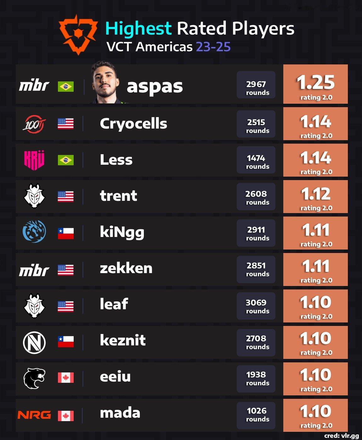 虎扑01月16日讯外媒统计2023-2025美洲赛区最高rating选手: