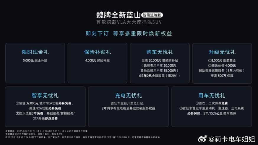 魏牌全新蓝山智能进阶版上市啦,限时27.58万起! 很多人问我这车到底改了啥?简单说,就是给这台大六座SUV装了一个“超级大脑”+“老司机双腿”。1️⃣ 更聪明了: 搭载了VLA大模型,不再是只会执行指令的机器。你喊一句“远离大车”,它自己就懂往旁边挪挪拉开距离,很有“人味儿” 。 2️⃣ 更稳了: Hi4性能版四驱,百公里加速4.9秒 。最贴心的是新增了底盘阻尼预瞄,过减速带前悬挂会自动变软,家里的宝宝睡着了也不容易被晃醒 。 3️⃣ 更安全: 关键部位用了2000兆帕的热成型钢 ,这硬度是什么概念?就是为了守护全家人的“金钟罩”。大家觉得,27万多起步买台带大模型、带冰箱彩电的大六座SUV,香不香?魏牌蓝山
