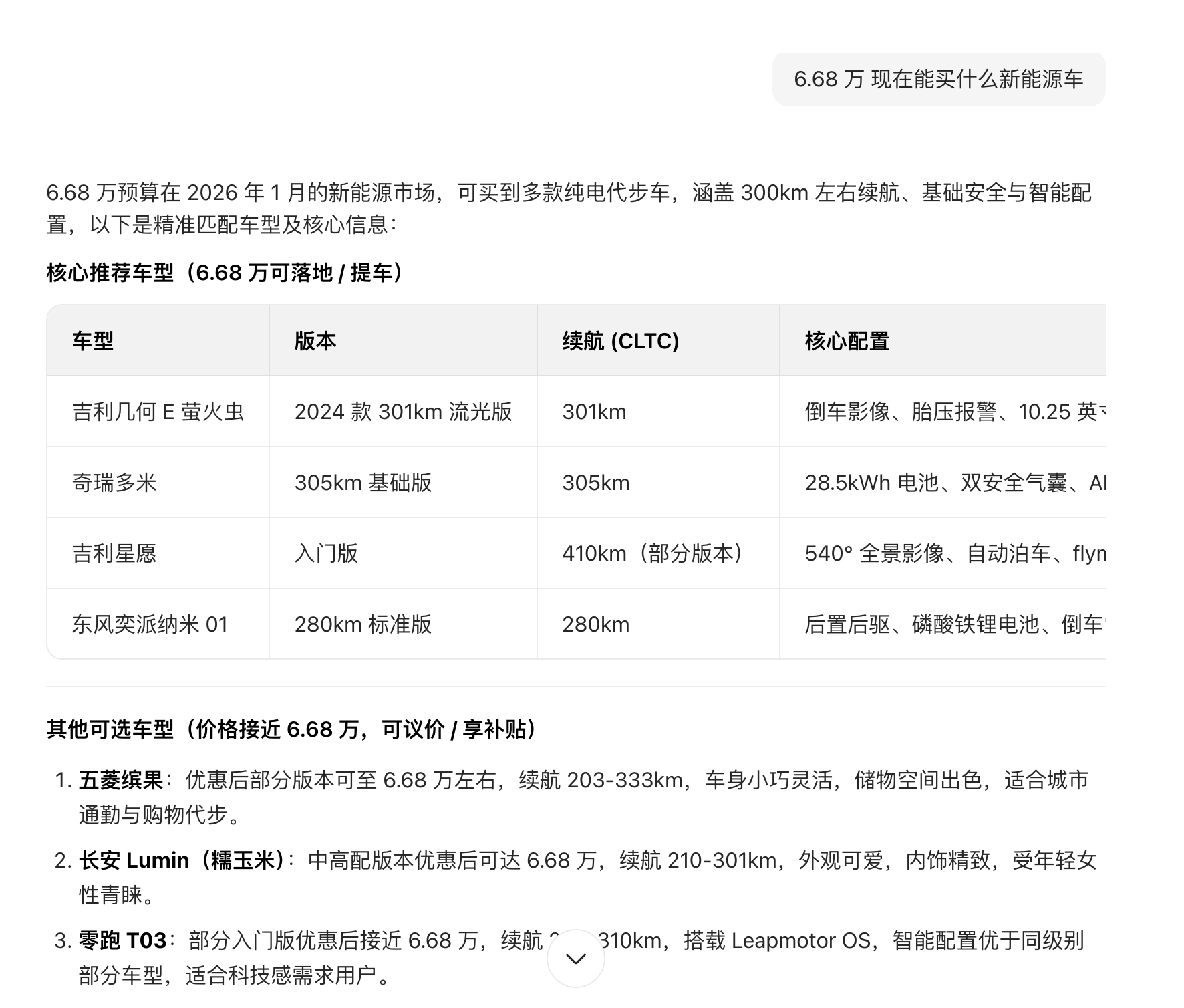 实话说,平时没怎么关注这个价格的产品,于是问了下豆包。手握 6.68 万,你们会选哪个?