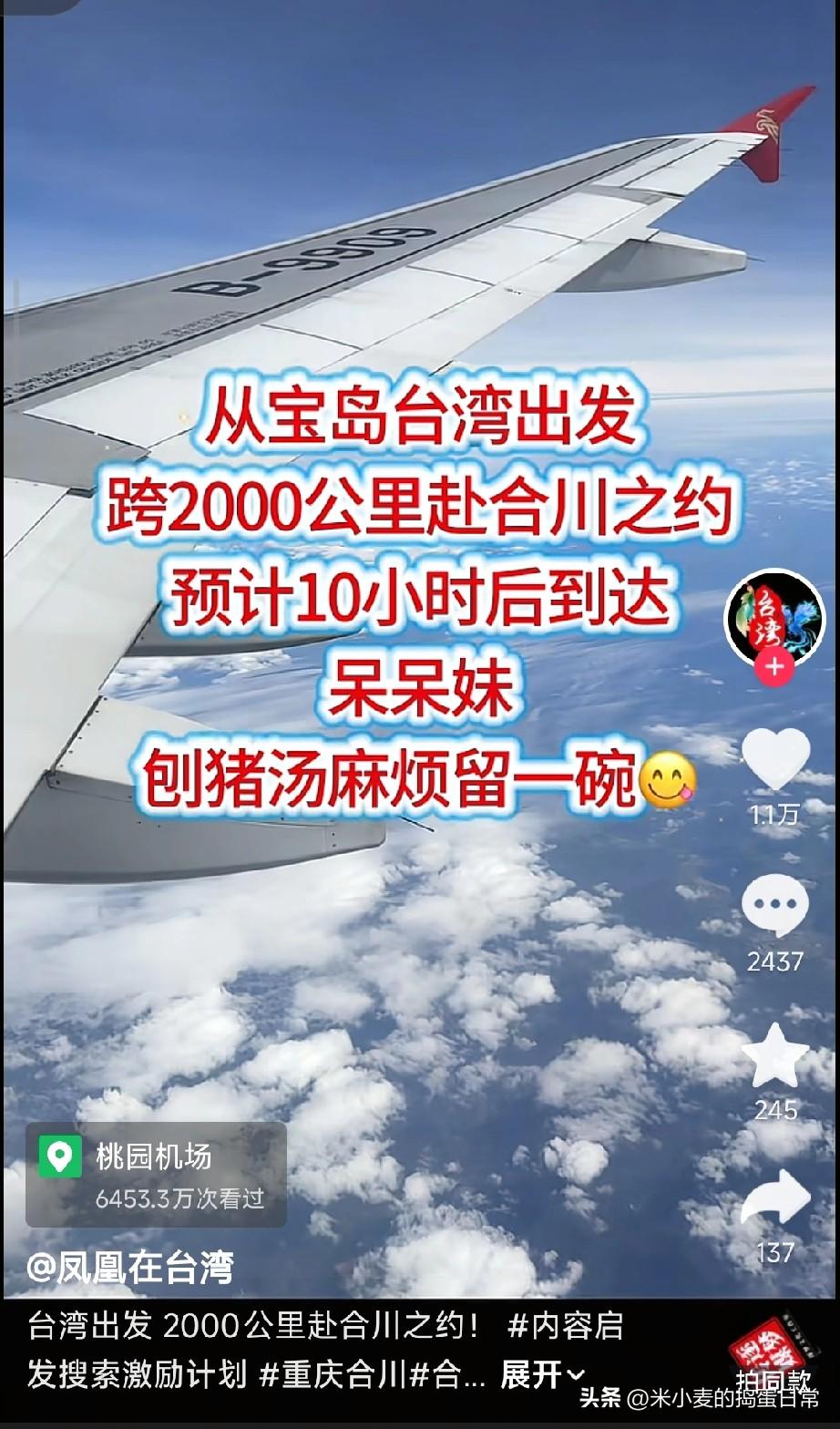 台湾美女要来呆呆妹家吃刨猪汤! 刷到个暖到心窝的视频,台湾的凤凰姐一行人从桃园机场出发,跨2000公里直奔重庆合川,就为赴呆呆妹的刨猪汤之约,光飞行就预计要10小时! 看着视频里她们在飞机上比耶的样子,突然就懂了啥叫“两岸一家亲”,一碗刨猪汤,牵起的是跨越海峡的情谊。评论区重庆网友热热闹闹喊着“欢迎”,凤凰姐还俏皮回“去还有吃的不”,隔着屏幕都能感受到那份热络。 刨猪汤本是川渝农村杀年猪的乡土味,没想到成了两岸朋友相聚的由头,食物从来都是最暖的纽带啊。不过话说回来,有人觉得为一碗汤飞这么远太折腾,也有人觉得这份奔赴特别珍贵,你觉得为了一口家乡味、一份朋友情,跨千里奔赴值不值?