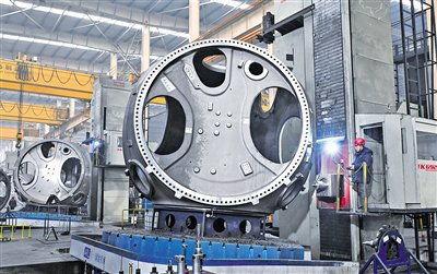 1月15日,在蒙东(通辽)高端重型基础装备制造产业基地,工作人员正在加工风力发电机零部件。近年来,科尔沁区加快风电装备制造产业发展,以内蒙古龙马重工集团作为核心企业建设该基地。基地计划实施26个子项目,涵盖风电85%零部件,全部建成后,将形成年产1万套轴承、2000台主机、3000台增速机、3000台电机及5000台套零部件的生产能力,可实现产值超800亿元,带动就业2万人。本报记者孟和朝鲁摄