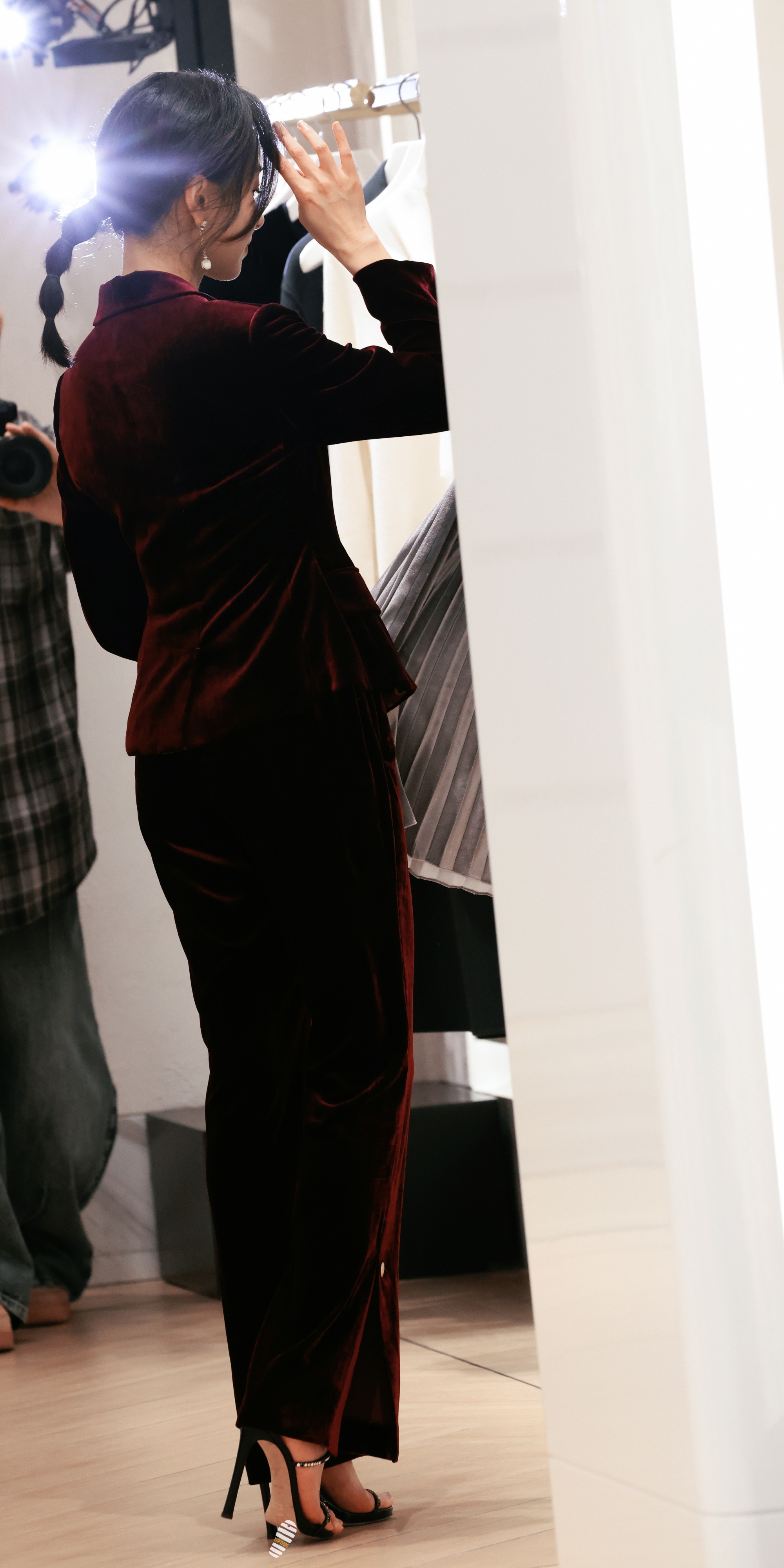 刘诗诗的松石绿缎面衬衫,利用面料的垂坠感中和了半裙的利落,打造出层次丰富的职场优